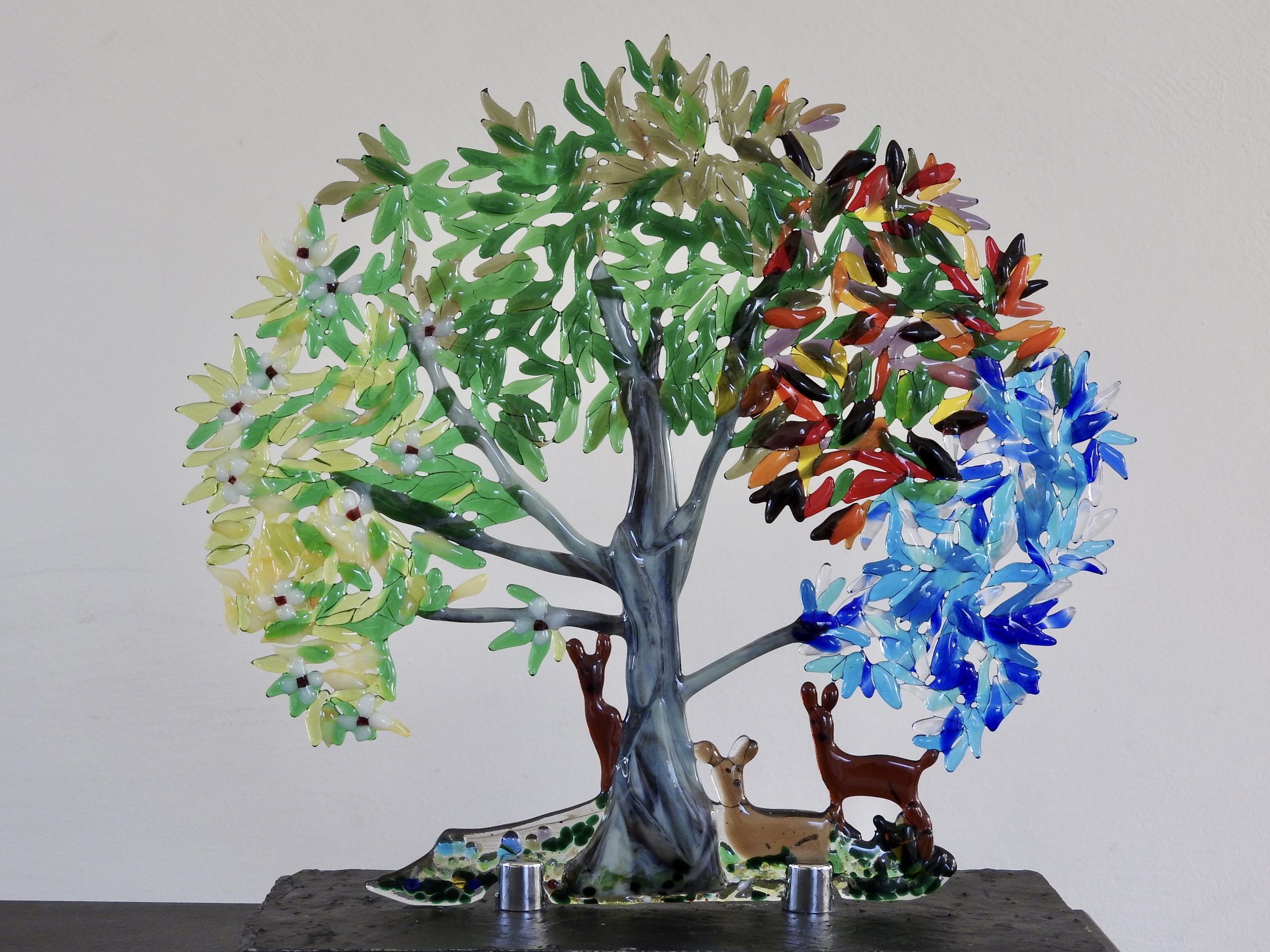 Opdracht: De kale boom op een rouwkaart met daaronder hertjes. De boom een 4 seizoenen bladerenkroon gegeven en het aantal hertjes teruggebracht naar 3. Staan voor dochter en haar twee broers