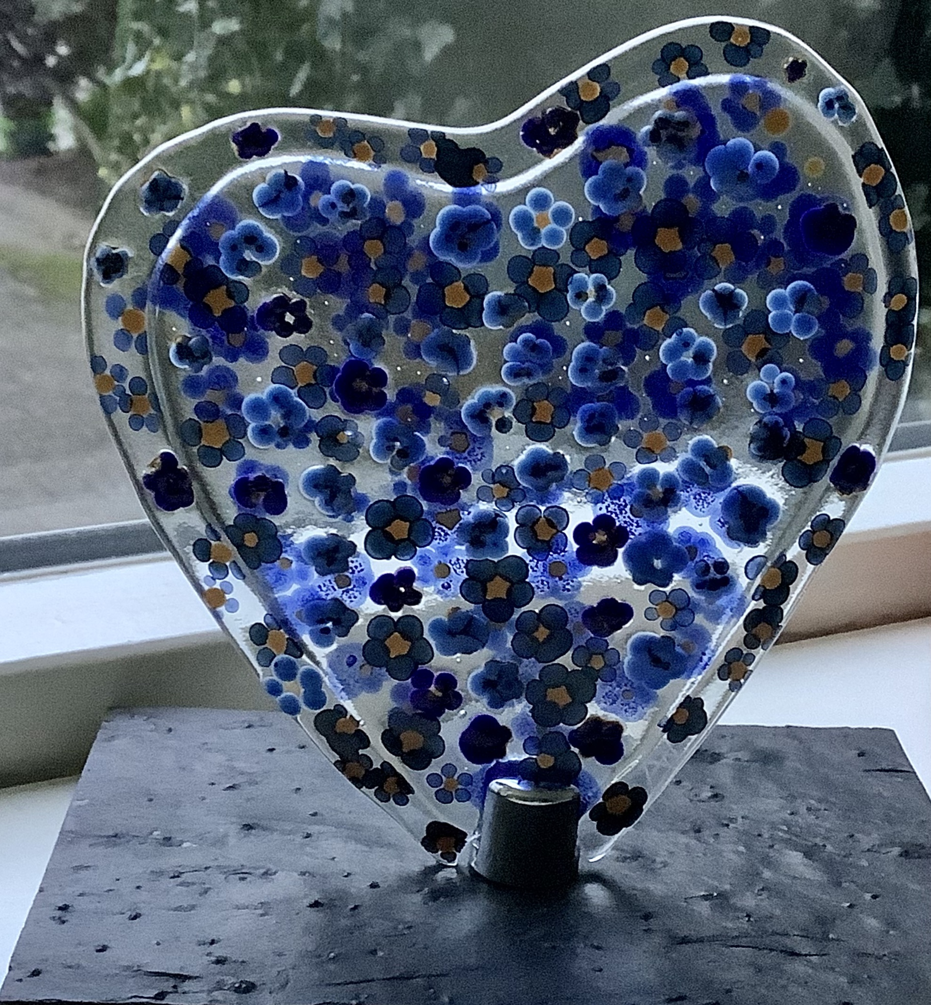 Vergeet mij nietjes op hart. Opdracht: om het hart op de rouwkaart van een moeder die leed aan alzheimer te maken in glas.