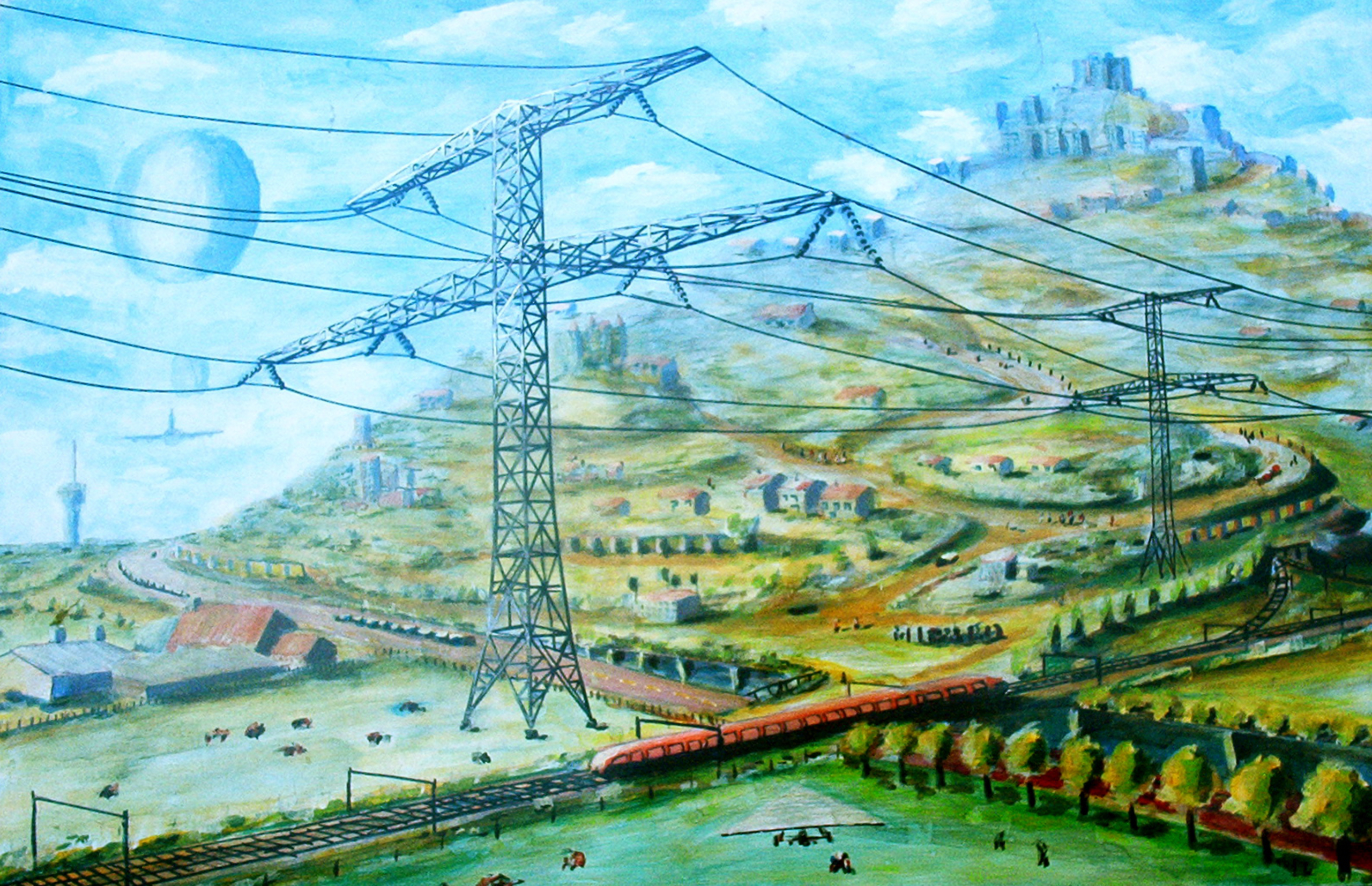 Gulbergen Catalogus nr. 247 Artistiek impressie van een mogelijke toekomst van de Gulbergen. De Gulbergen is een voormalige vuilnisstortplaats op de grens van de Nederlandse gemeenten Nuenen, Gerwen en Nederwetten en Geldrop-Mierlo (provincie Noord-Brabant). De Brabantse boerenhoeve, links onder op het schilderij, is nu de entree van de dierentuin 'Dierenrijk'.