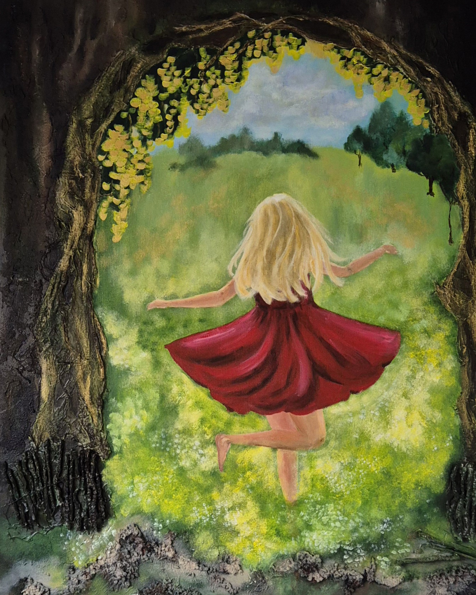 'Ik ga door de poorten met een loflied...' Dansend over de drempel om de tuin binnen te gaan die God voor mij heeft gemaakt. Een nieuw begin... Dit werk is ook als art print te bestellen.