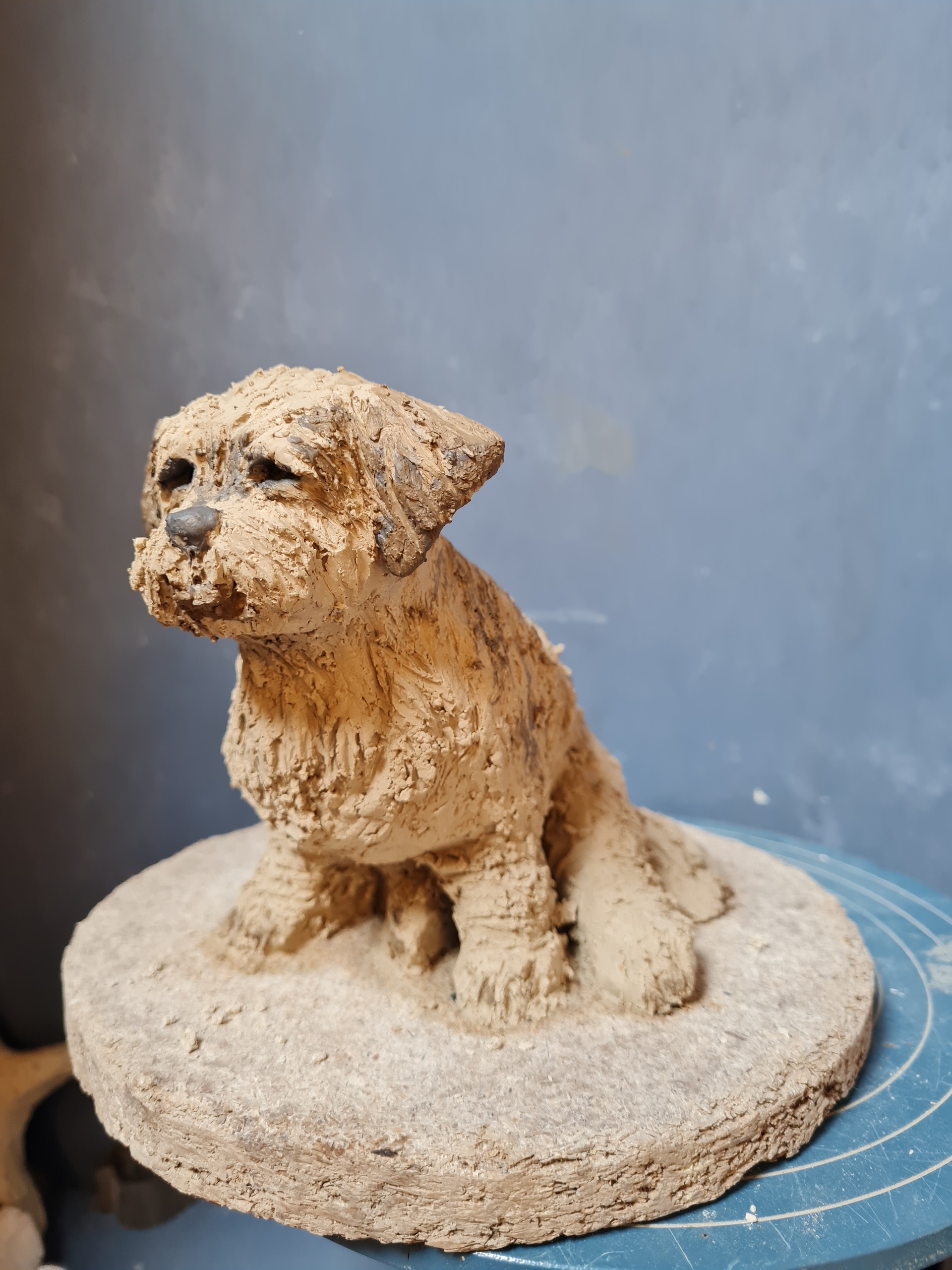 Hondje van een goede bekende. Klei met gekleurde kleislib. Hier nog ongebakken.