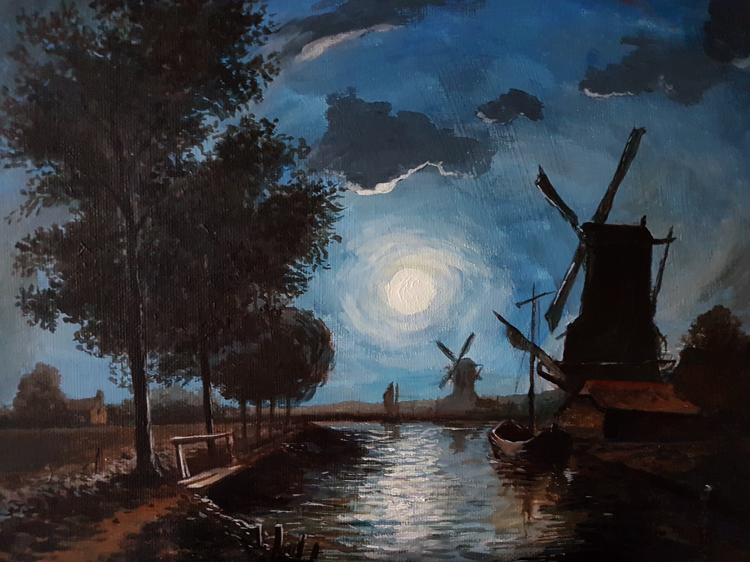 Molens aan een vaart bij maanlicht
