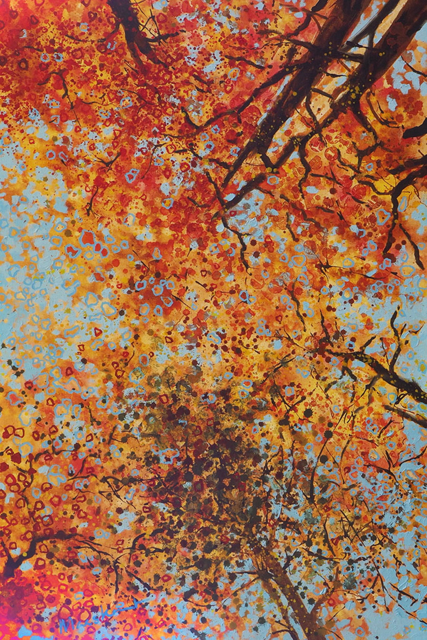 Loop je in het bos en kijk je omhoog dan zou je dit kunnen zien, ik vind het fascinerend hoe bomen er het hele jaar door uitzien. Zijn ze kaal in de winter dan zie je heel mooi de takkenstructuur, in de lente het prille groen, vol groen in de zomer en prachtige oranje tonen in de herfst. Ik schilder bomen het hele jaar door!