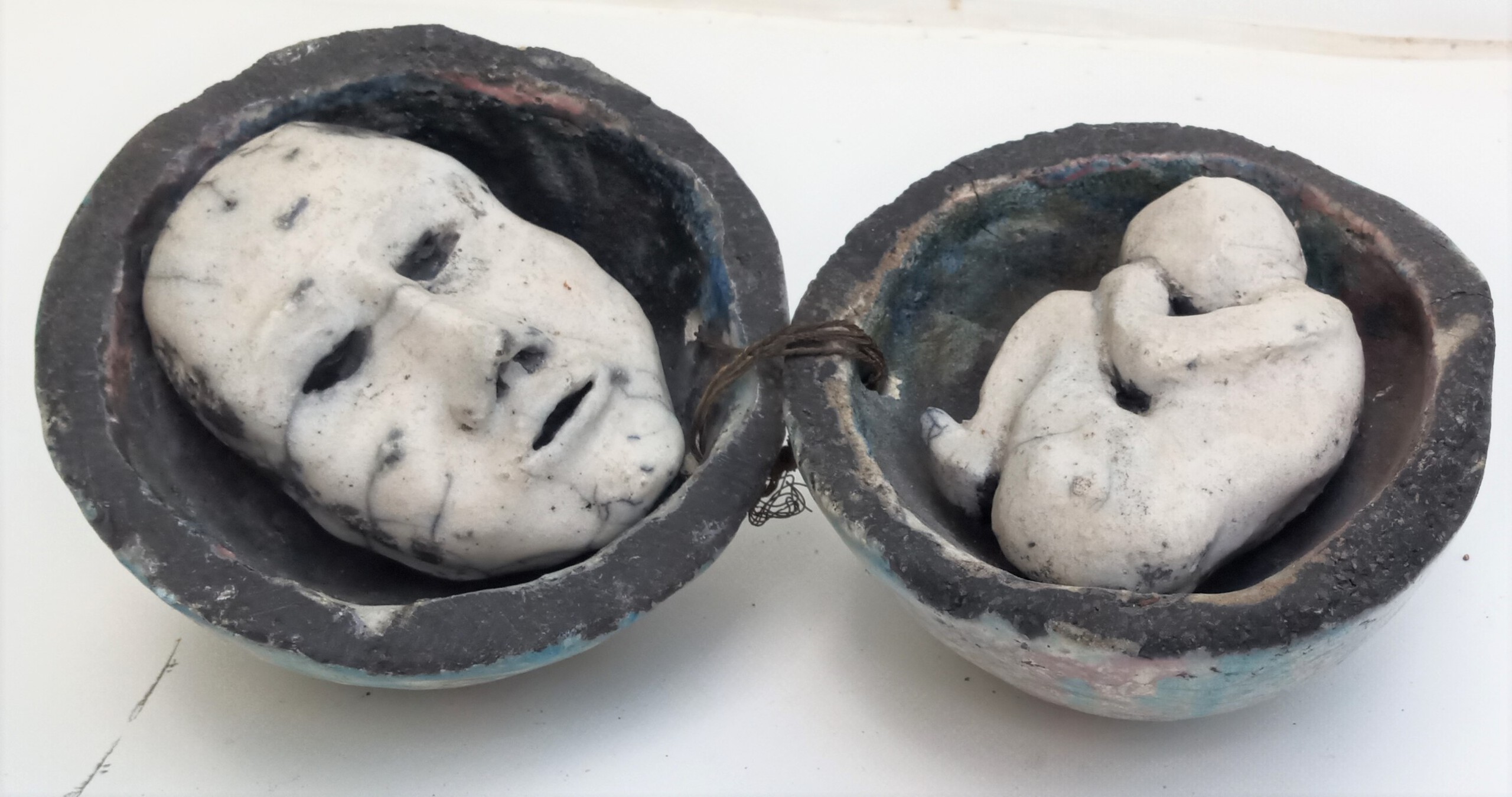 Ik kijk naar mijn verleden (twee halve bollen, raku gestookt)