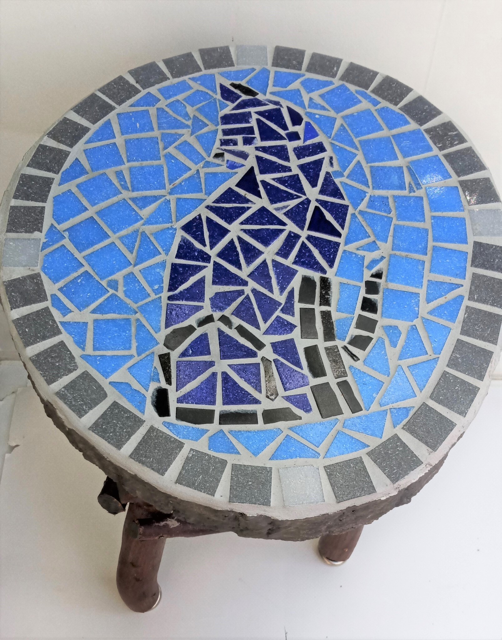 Kat van Mozaiek op bovenkant van stammen krukje,natuurlijk materiaal, 3 poten