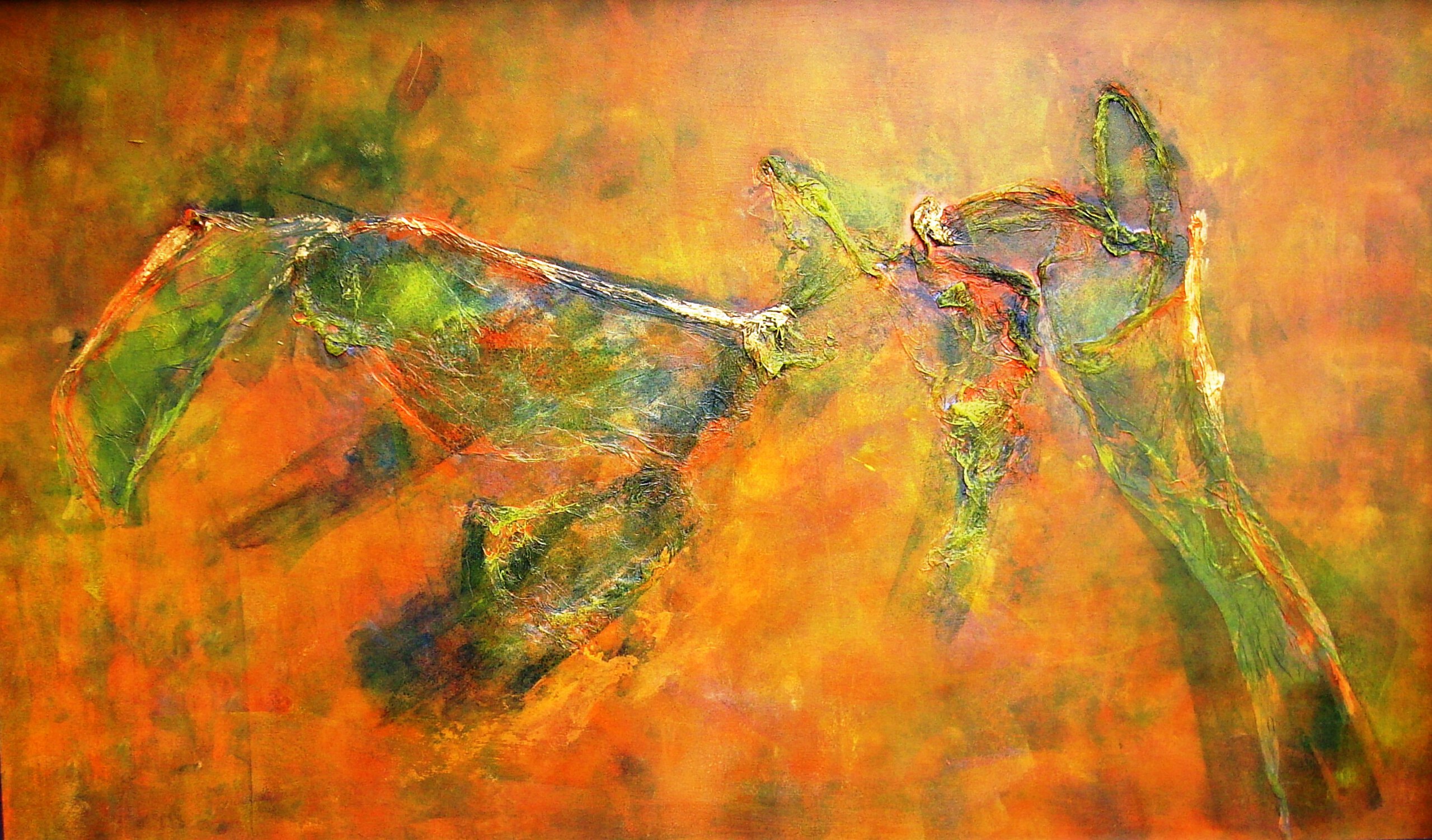 Vechtende vogels, abstract, in blauwe houten baklijst
