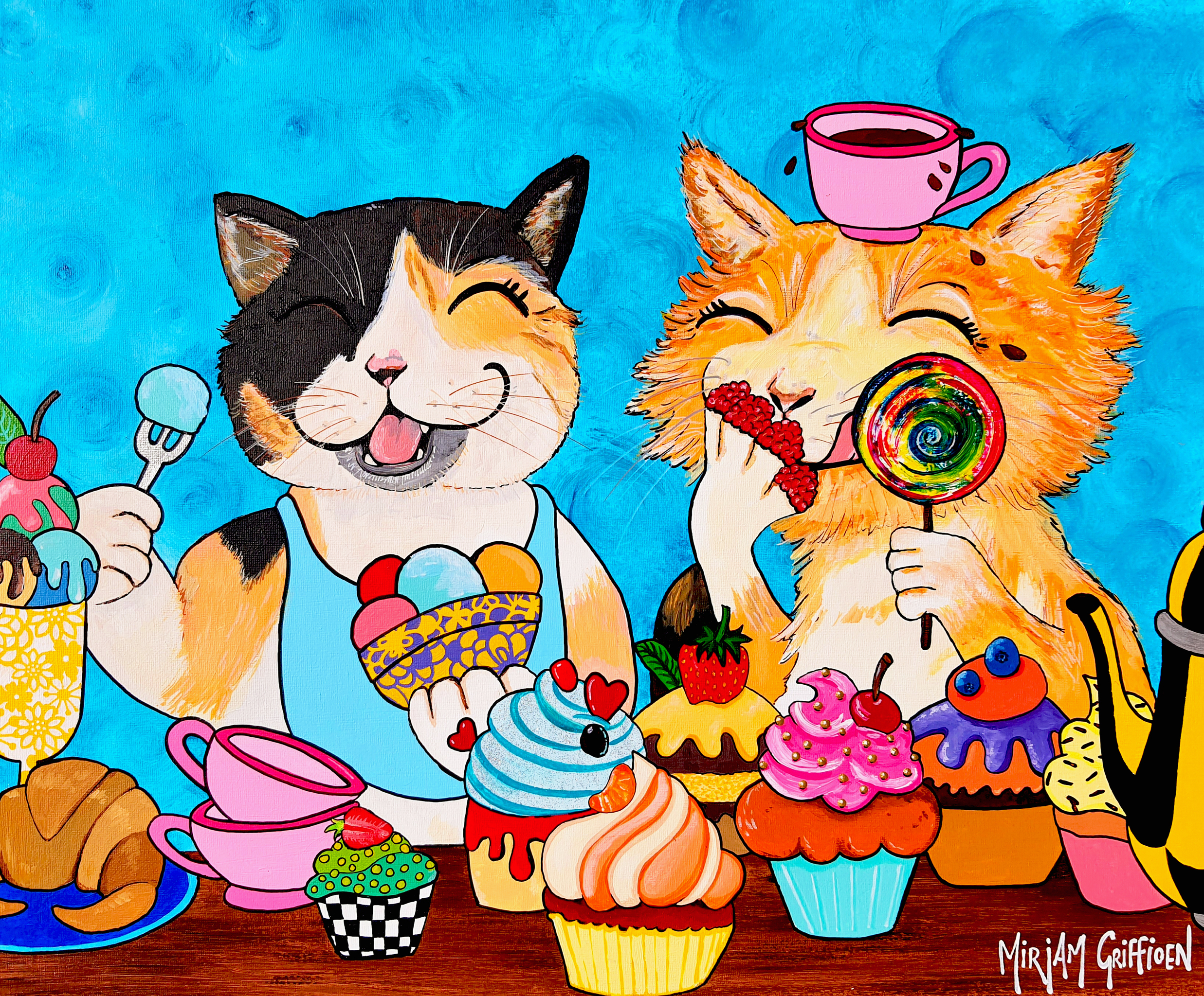 Poes Poezen Cat Kat Katten Kleurrijk Colorfulcat Poema Kattenliefde Meow Hightea Painting Mirjamgriffioenart Chat Gato Cake Treats Taart Lolliepop Popart Modernart Kattenopvang Stoeipoes Tompoes Aaipoes