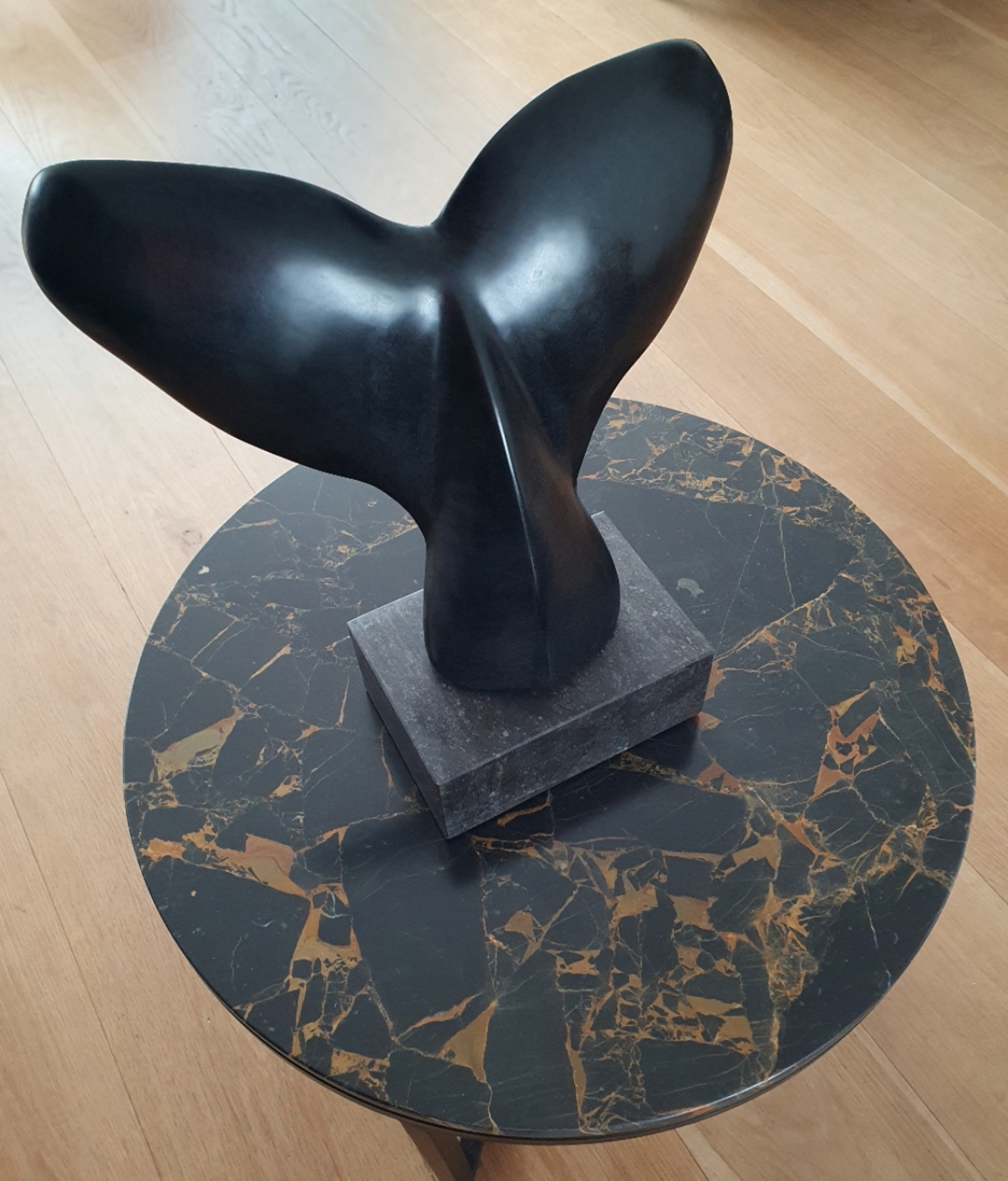 Whaletail gemaakt uit Galastone. Geplaatst op een hardstenen sokkel.