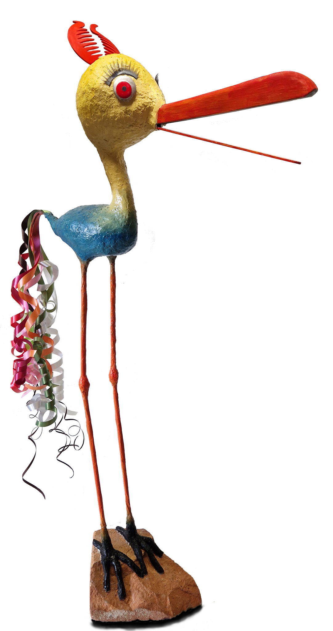 geel blauwe vogel met curlinglint als staart vervaardigd van papier-maché