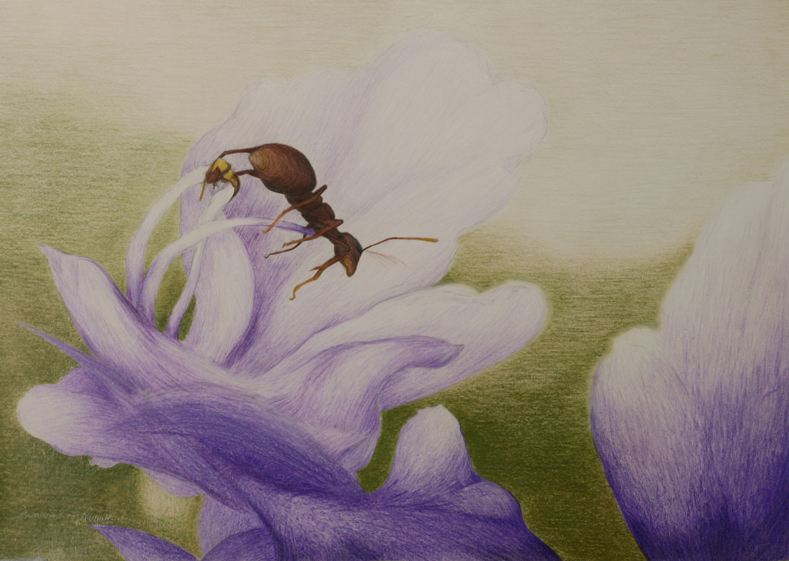 Figuratief Paars Groen Bruin Tekening Realistisch Op Bloem Kleur Potloodtekening Verleiding Mier "realistische Bloem"