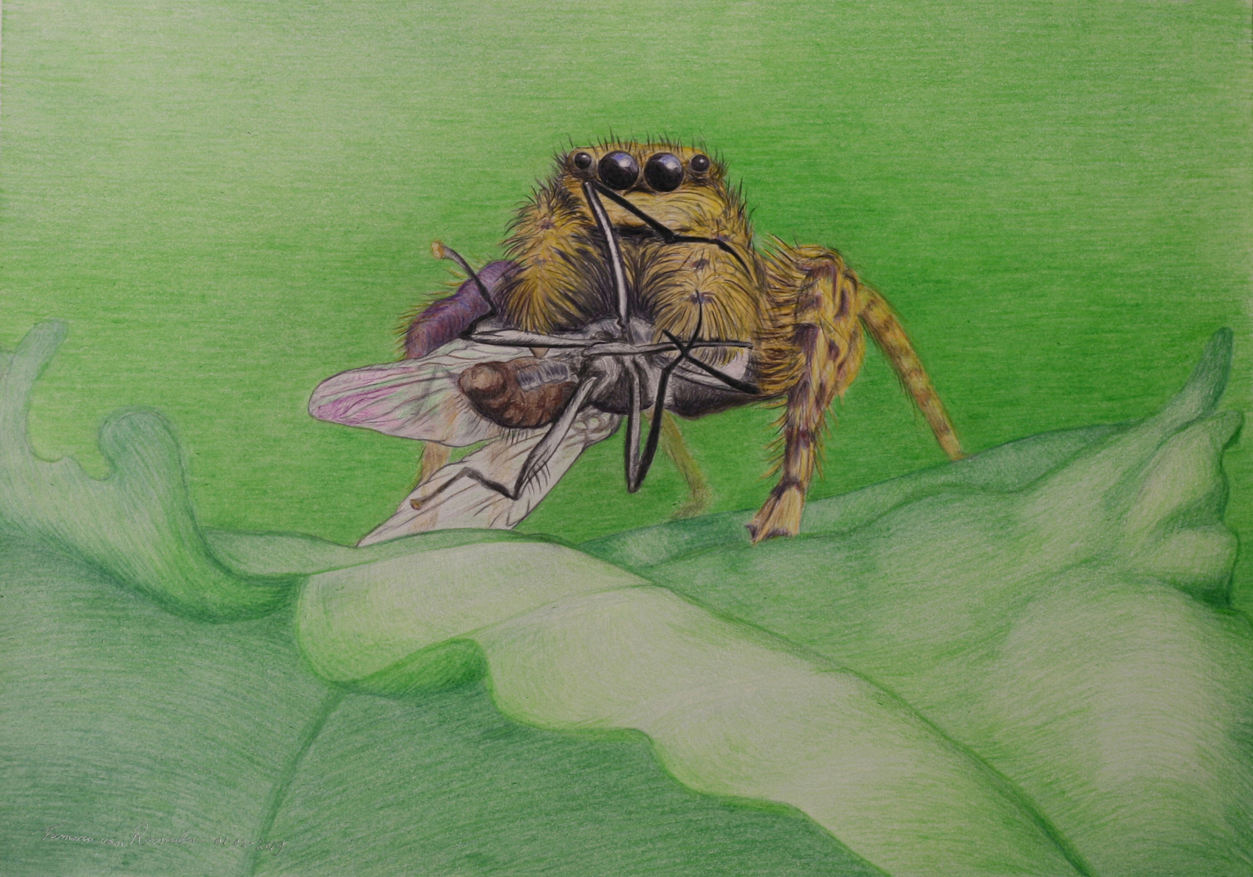 Figuratief Oker Groen Ogen Van Tekening Realistisch Met Vlieg Insect Kleur Spin Potloodtekening Prooi Frontaal Aankijken Schorsmarpissa Staredown "stare Down" "illustratieve Uitstraling" "potloodtekening Spin" "realistische