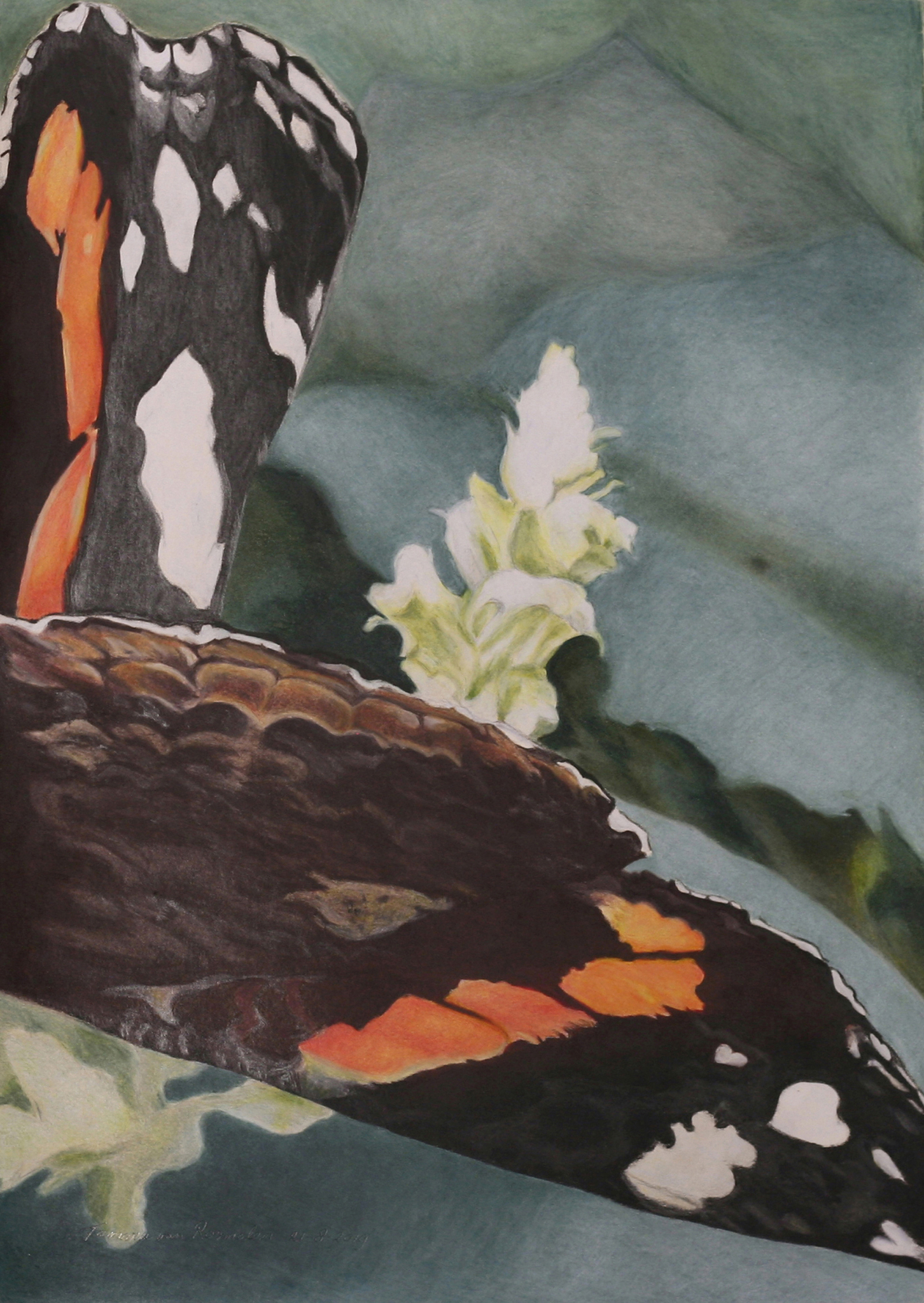 Abstract Figuratief Oranje Zwart Blauw Groen Bruin Vleugels Vlinder Dier Tekening Realistisch Natuur Insect Kleur Atalanta "close Up"