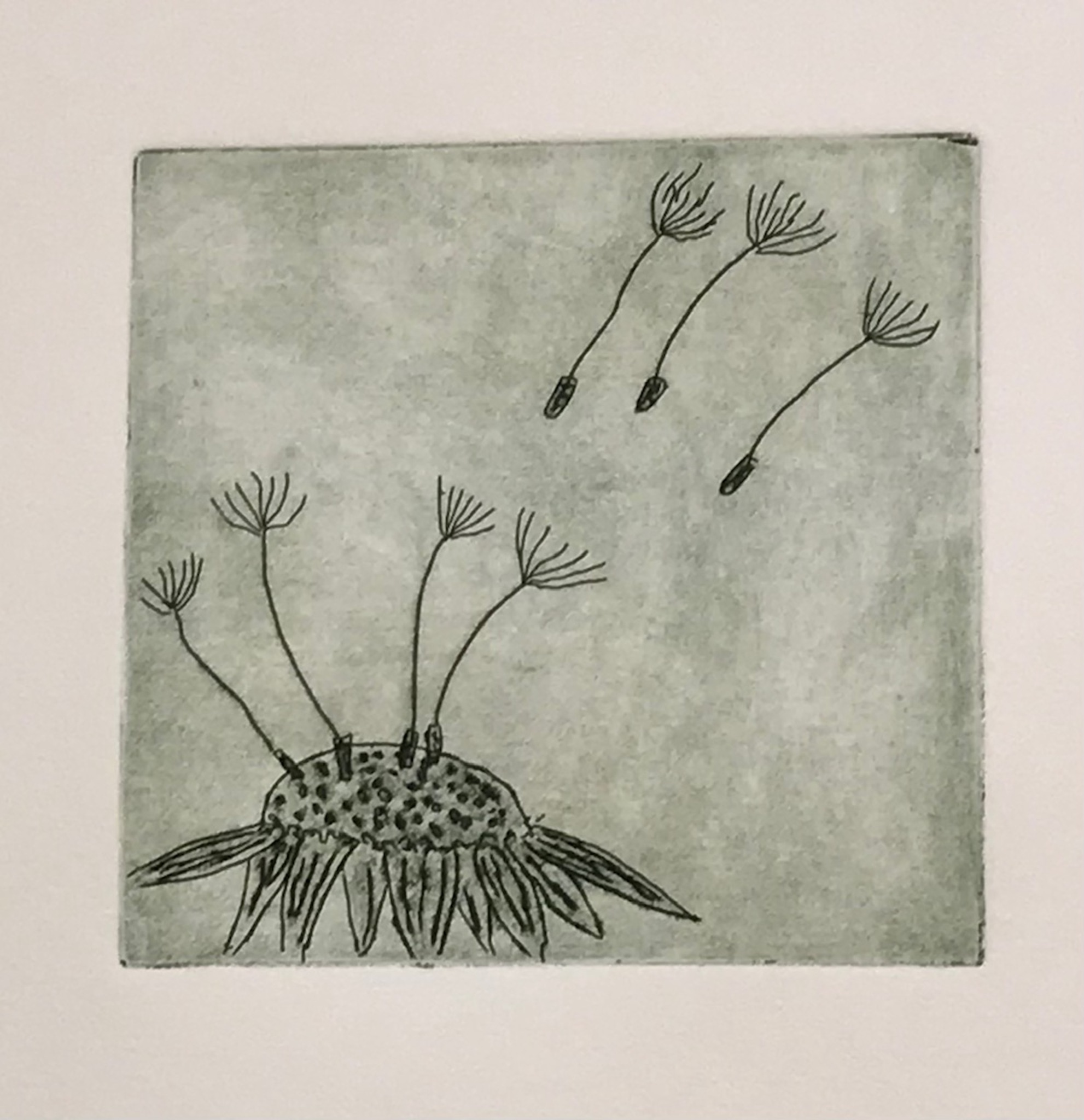 verandering: van paardenbloem tot uitgebleoide paardenbloem, de pluizen waaien in de wind. ingelijst met passepartout 20x20cm