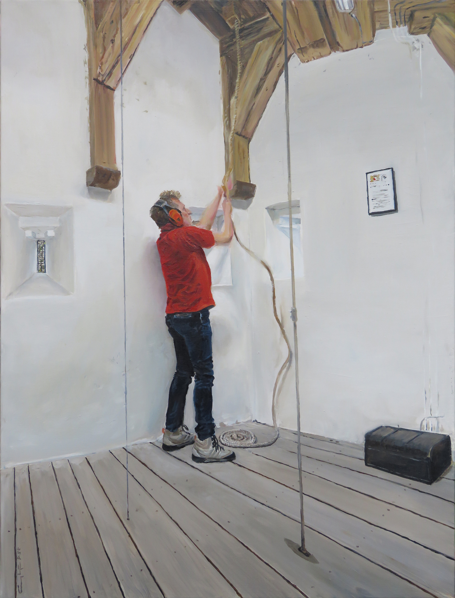 Laten we eens een stadsbeeld binnengaan, zoals de toren van de Geertekerk. Ik klom behoedzaam de trap op, om vooraf de ruimte te bekijken. En paar weken later had ik een afspraak, met een klokkenluider. Een stuk geschiedenis dat nog steeds gebeurt. Ik wilde het schilderen. De kleine ruimte tussen twee verdiepingen boven de klokken, daaronder het klok mechanisme. En hij, ging helemaal "zen..."Een man als deze laat dus in onze steden de klokken luiden. Geconcentreerd, aandachtig toegewijd.