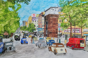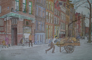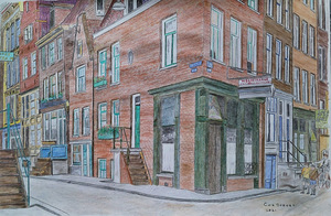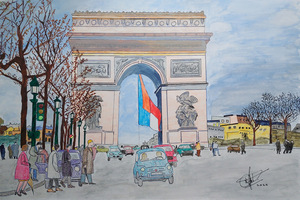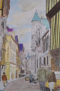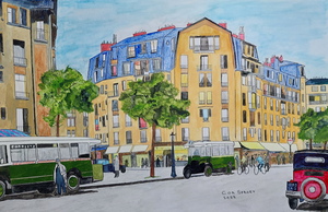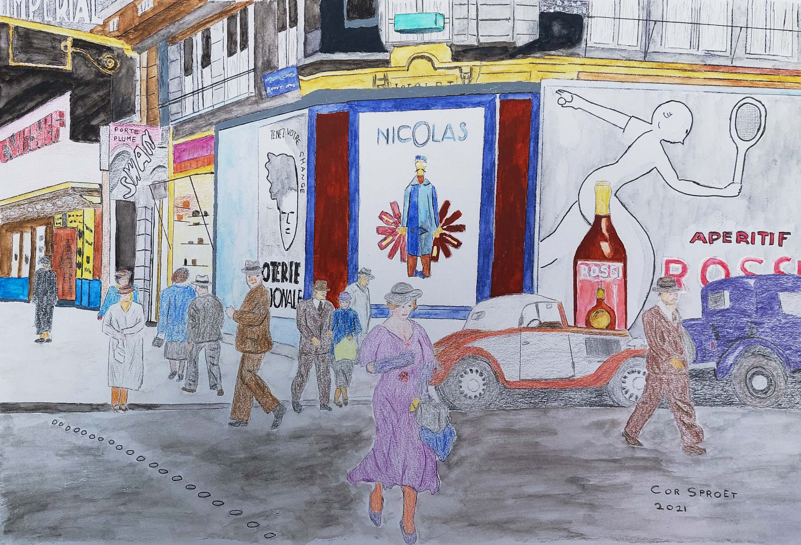 Met deze tekening gedaan met aquarelle verf en kleurpotlood op 160 grams Fabriano papier wil ik wijzen op de grote affiches vaak op de Parijse boulevards te vinden zijn. Op een schutting rondom een verbouwing op de Boulevard des Italiens en de rue de la Michodiere zijn een paar afiches die een wijnhandel, de staatloterij en Martini Rossi aanprijzen. Tijdvak eind 1939.
