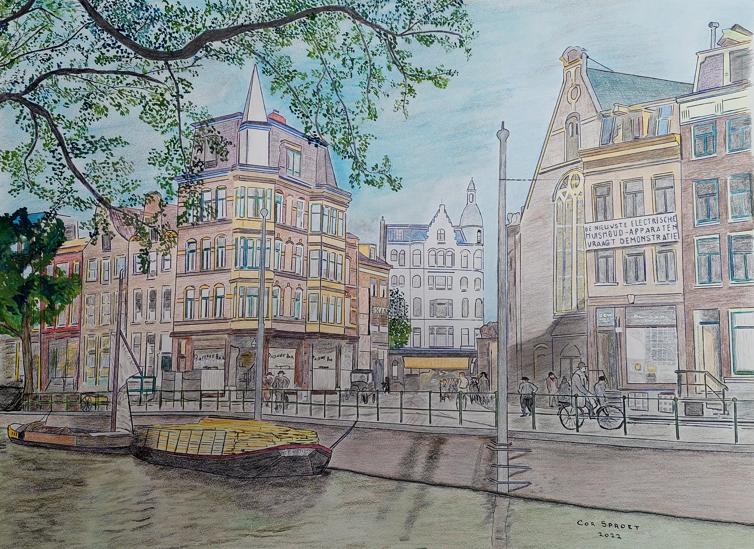 Op deze mixed media staat hety mooie gebouw met de Passage Bar prominent in het midden, Het is Amsterdam 1925. Voor dit werkstuk hen ik aquarelle verf, inkt en kleurpotlood gebruikt