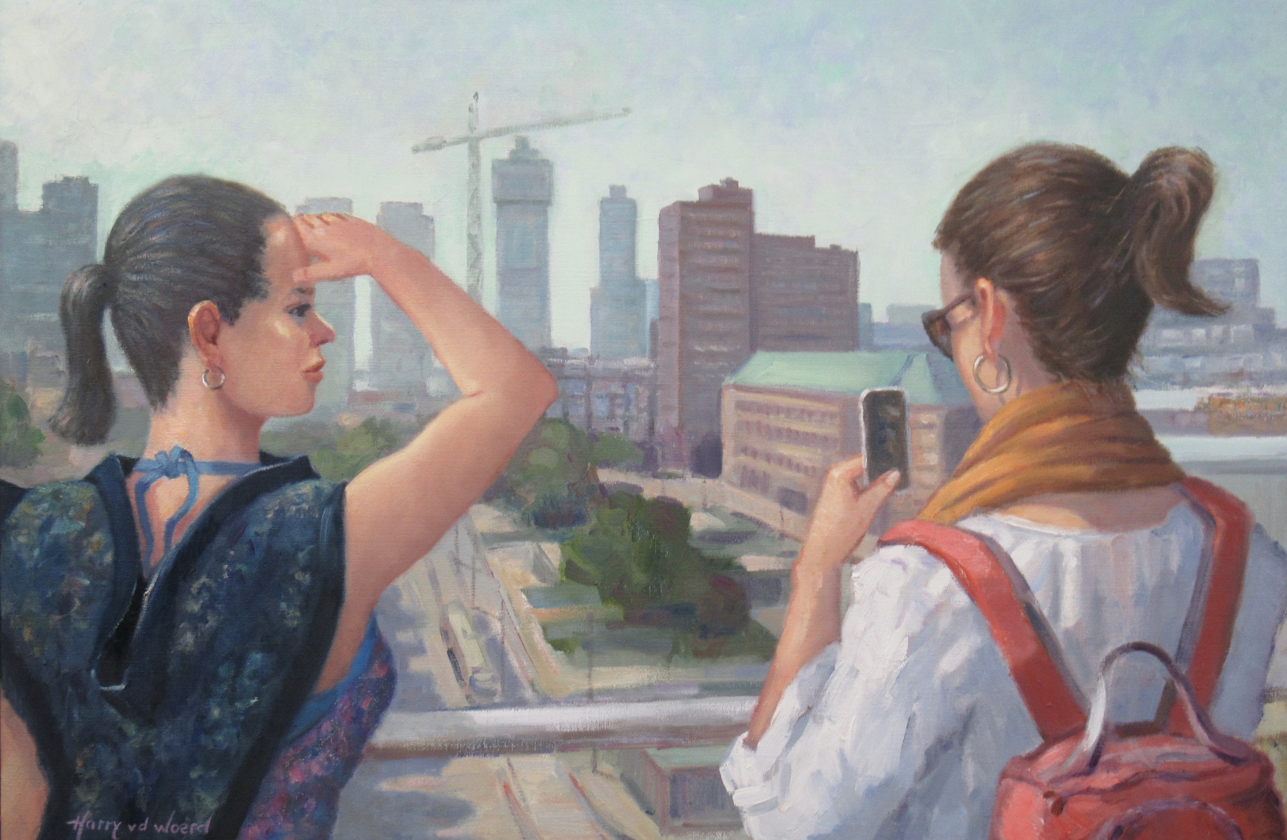 Samen met een vriendin de dakwandeling gelopen. Een prachtig uitzicht op mijn stad, gelijk een tekening gemaakt van de vriendin dat ze stond te fotograveren. Op mijnn atelier een schilderij van de tekening gemaakt, ook het model waar ik mee werk in het schilderij geplaatst.
