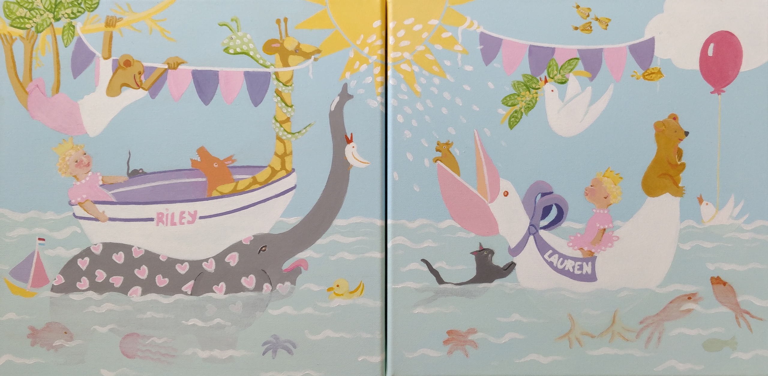 Een tweeluikje geschilderd in opdracht als geboortekado voor een tweeling.