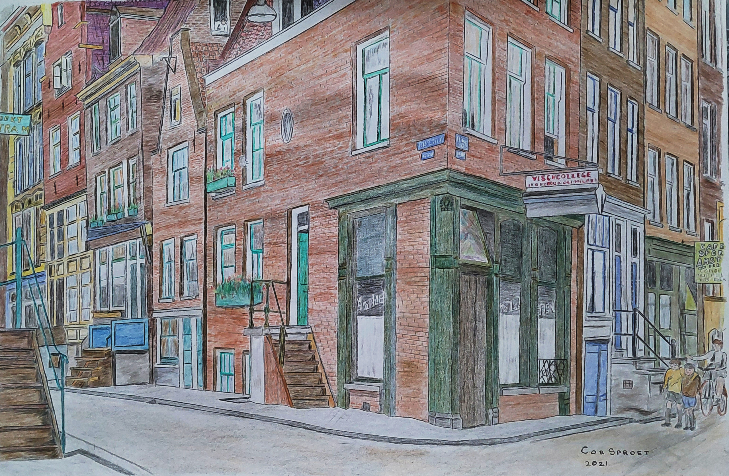Kleurpotlood en pastel tekening die een blik werpt op de hoek Willemstraat en Brouwersgracht in de Amsterdamse Jordaan 1905. Als media kleurpotloden en pastels op 125 grams Royal paper.