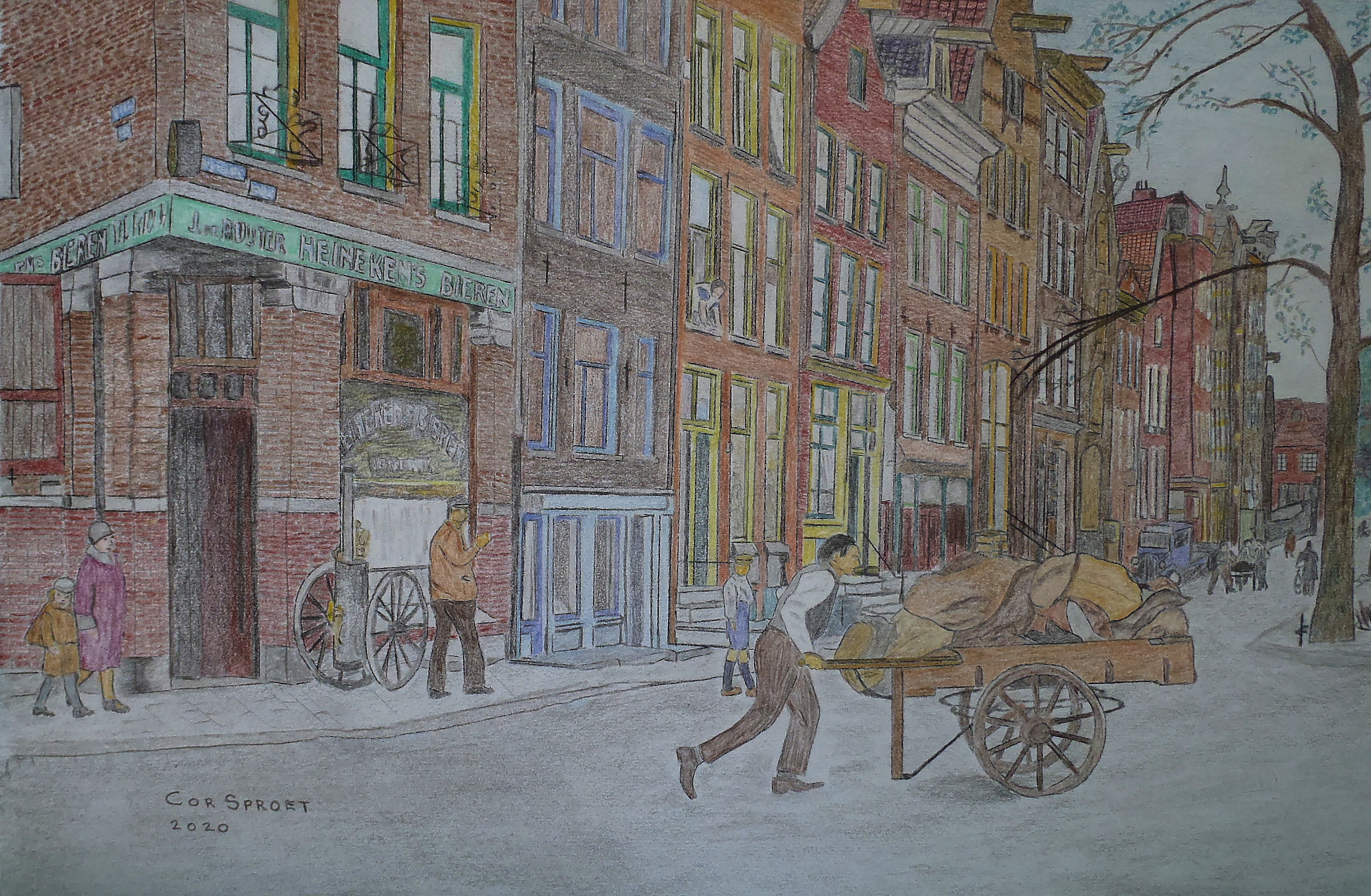 Op de achterzijde van deze tekening staat mijn handtekening, datum en de titel van deze kleurpotlood tekening. Hoek Willemstraat en Brouwersgracht in de Amsterdamse Jordaan anno 1925. In een van de afgebeelde huizen woonde ik dus ik ken deze buurt heel goed. Dit werkstuk is op 100 grams Strathmore papier afgebeeld.