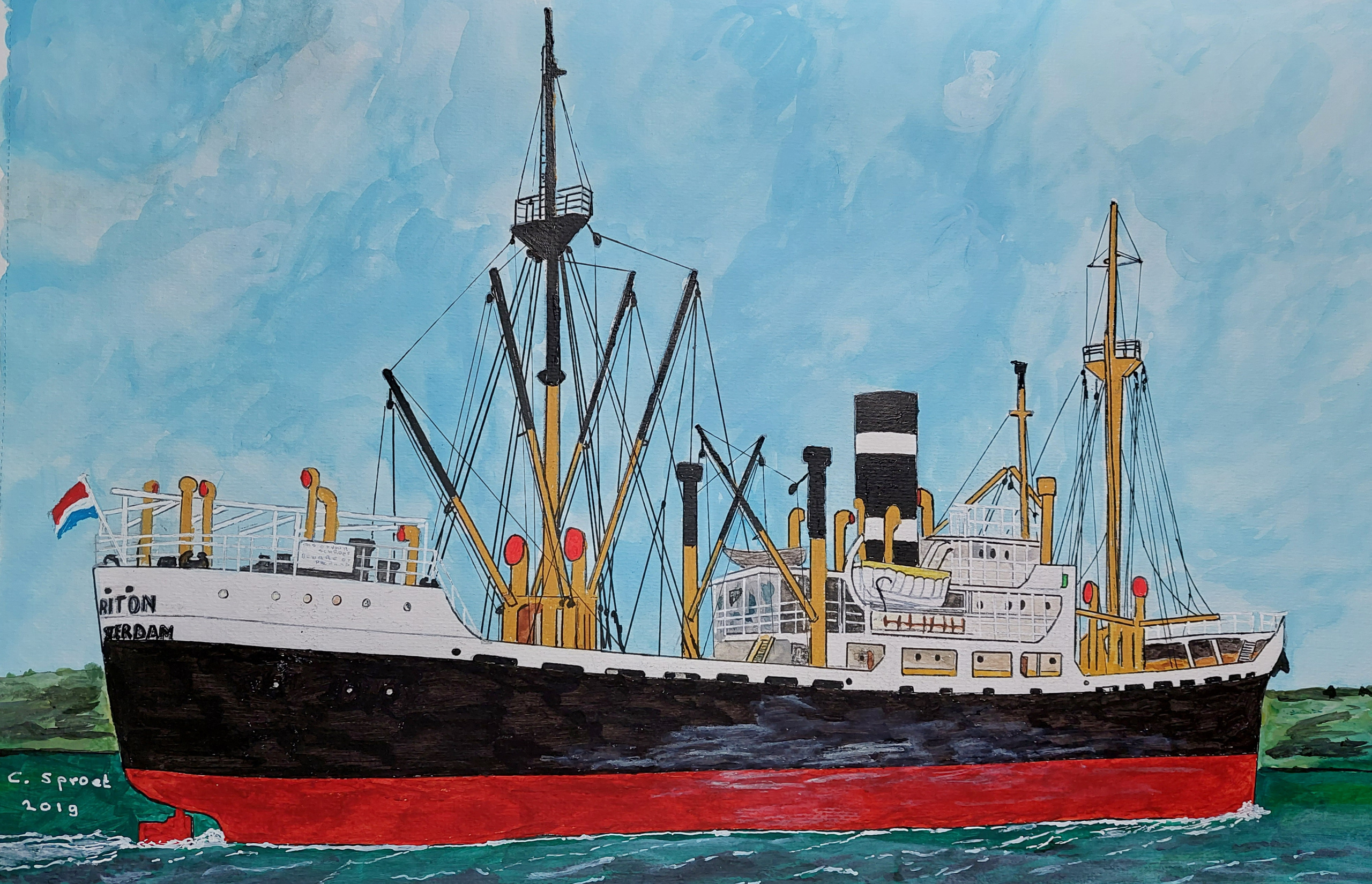 Het m.s. Triton van de Amsterdamse rederij KNSM vaarde meestal op de diensten naar Zuid en Midden Amerika. Het werkstuk is gedaan op Carson 200 grams aquarelle papier met acryle verf, waterverf en inkt. Op de achterzijde is mijn handtekening, titel, datum en nummer van het echtheids certificaat vermeldt.
