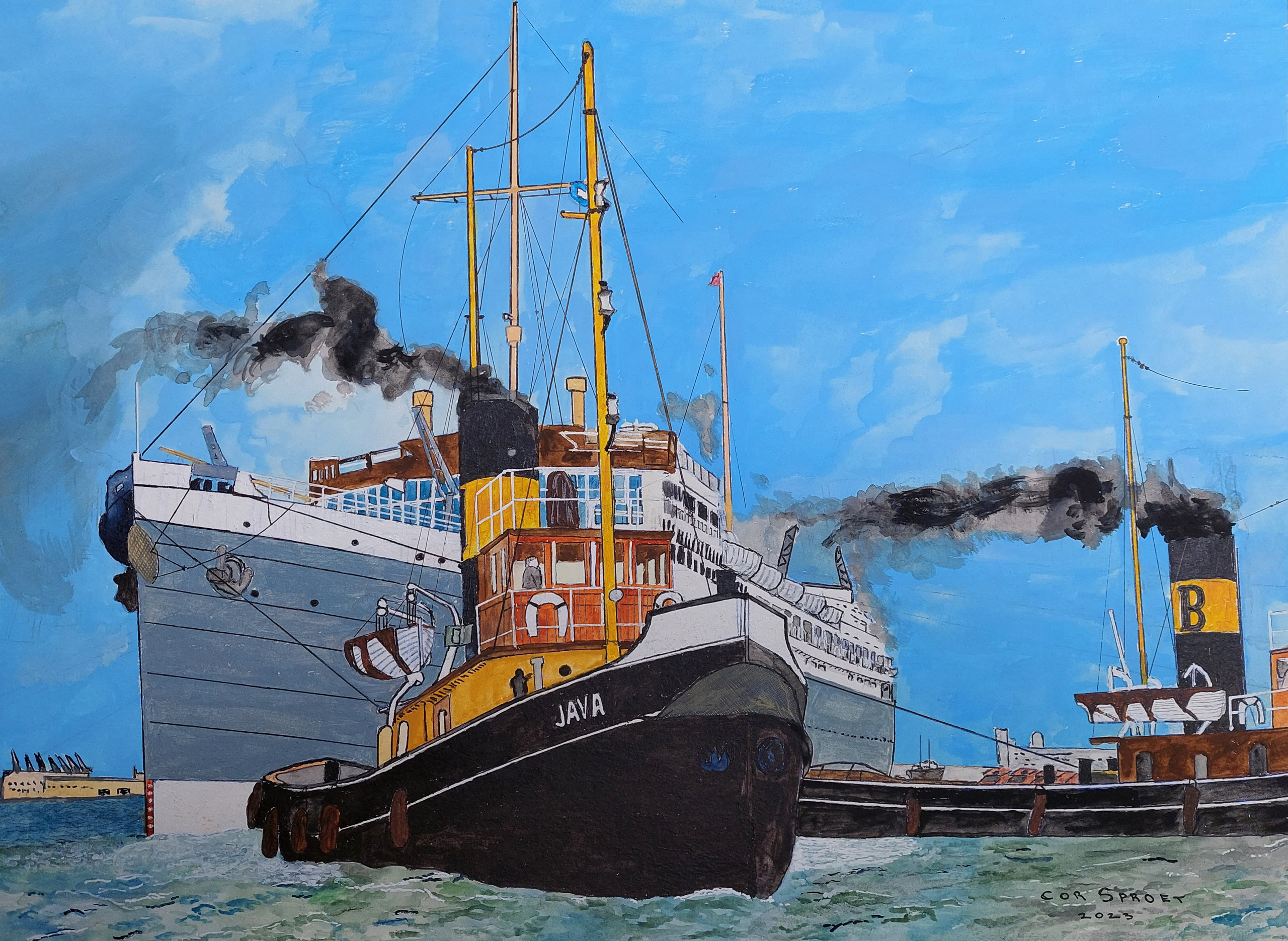 Het onderwerp van dit schilderij zijn twee sleepboten van Smit die de "Dempo" van de Rotterdamse Lloyd assisteren. Als media acrylverf en inkt op 300 grams board.