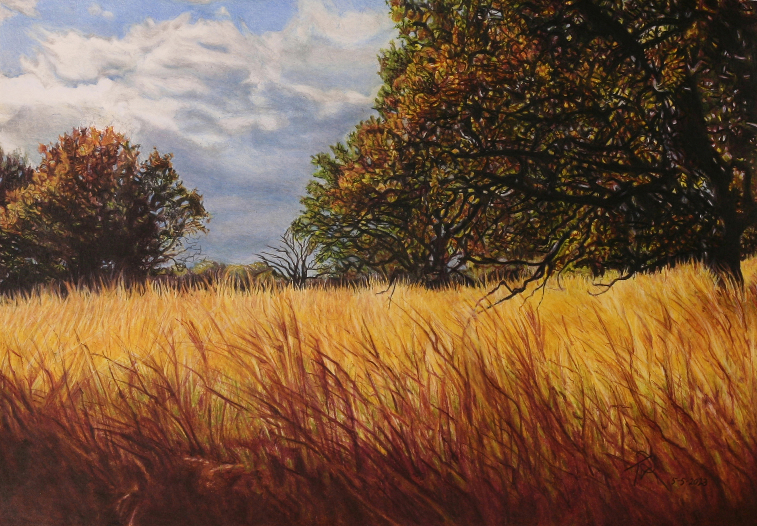 Rood Oranje Geel Zwart Landschap Blauw Wolken Bruin Licht Tekening Natuur Bomen Lucht Herfst Wind Zonnig Kleur Contrast "de Fotorealistisch Grashalmen Meinweg"