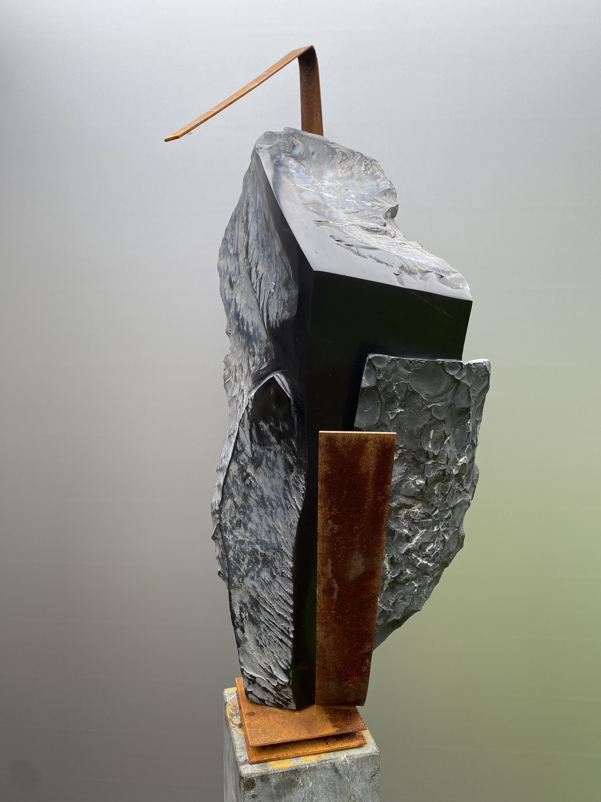 Beeld gemaakt van noir de Mazy en kortenstaal. Steen is aanleiding staal maakt het af. Verbeeld een danspas en past in een grotere serie