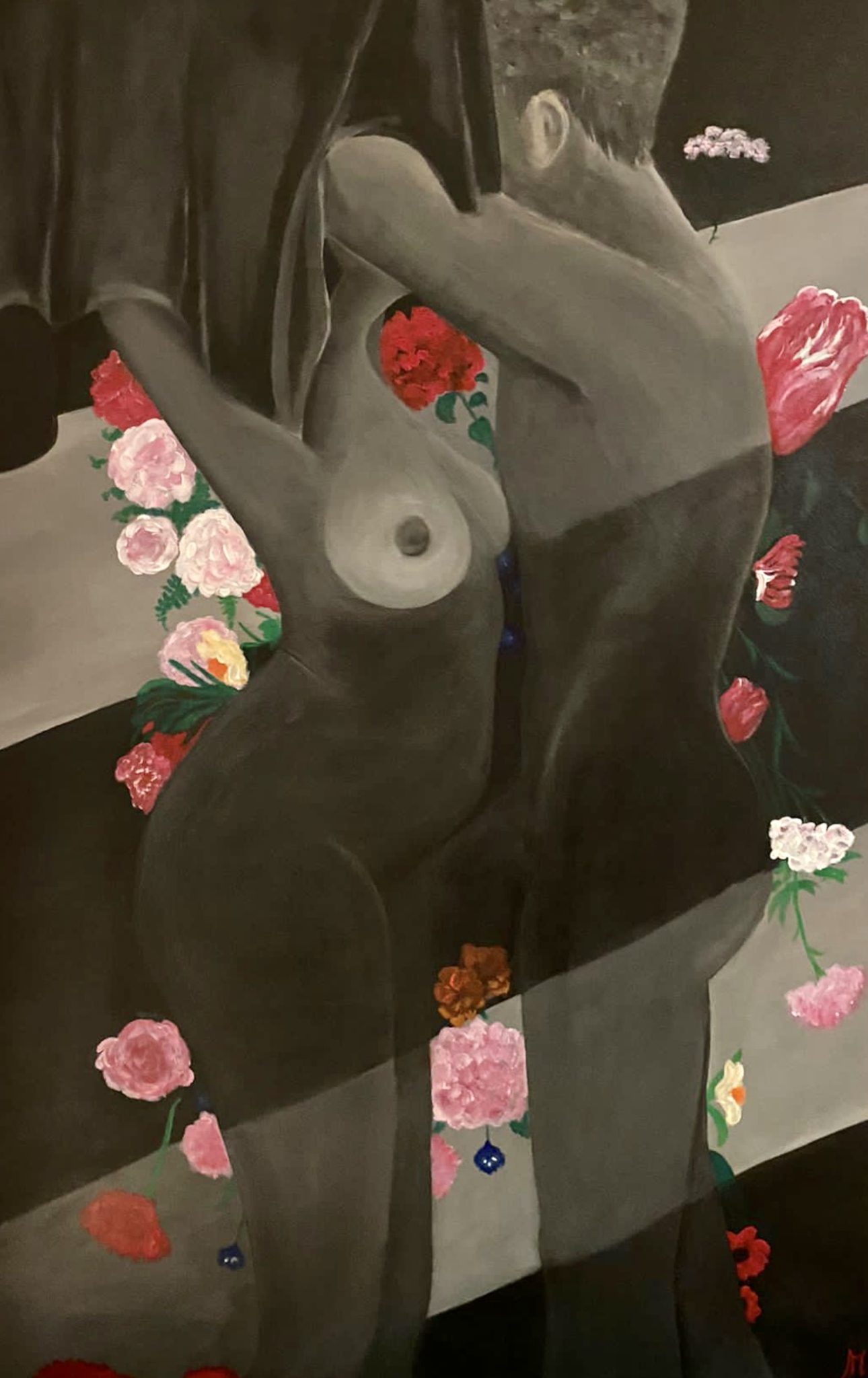 Sexy koppel na doucescene, gemaakt voor in de huiskamer, de bloemen uit een werk in de huiskamer moesten erin verwerkt worden.Geschilderd vanaf een foto aangeleverd door het stel.