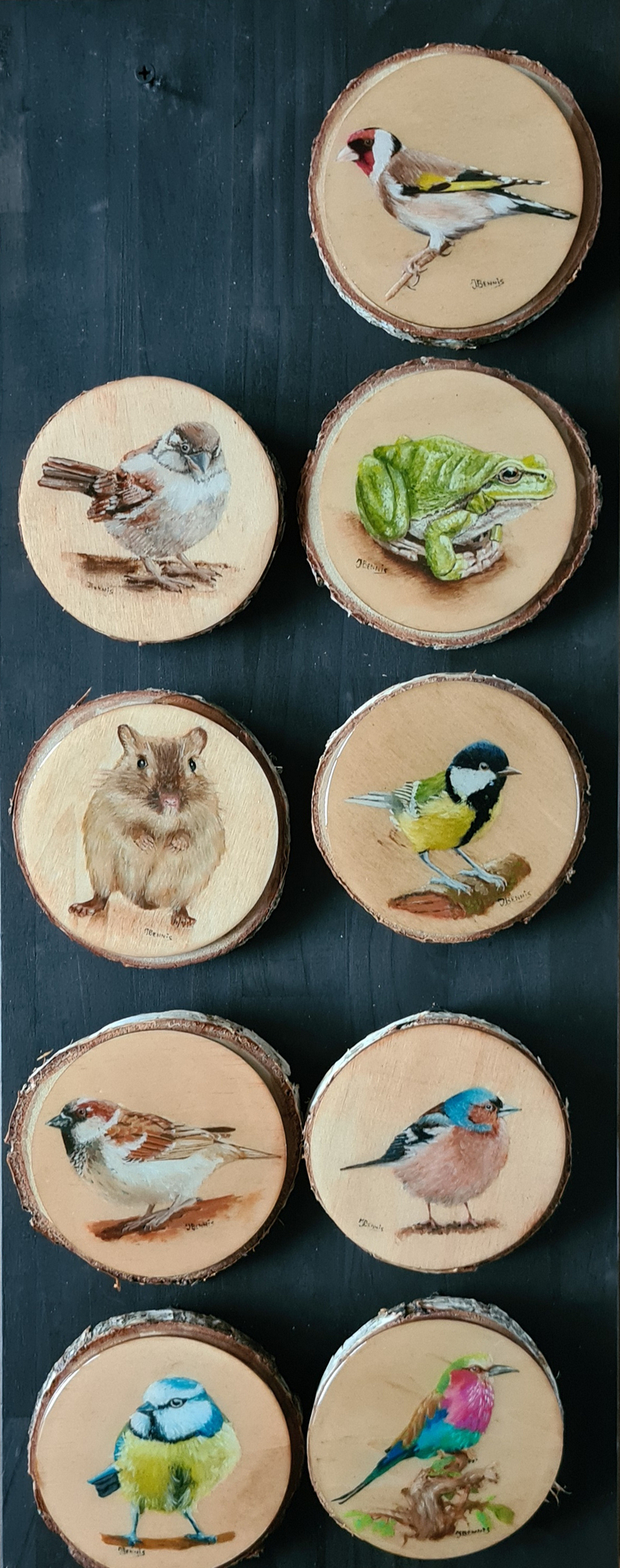 Fine art schilderijtjes diverse Mus1 Mus2 Kikker verkocht Muis Koolmees Pimpelmees verkocht Putter Vink Vorkstaartscharrelaar verkocht prijs is per stuk Olie op hout op boomschors en afgegoten met enkele lagen epoxylak met ophanghaakje