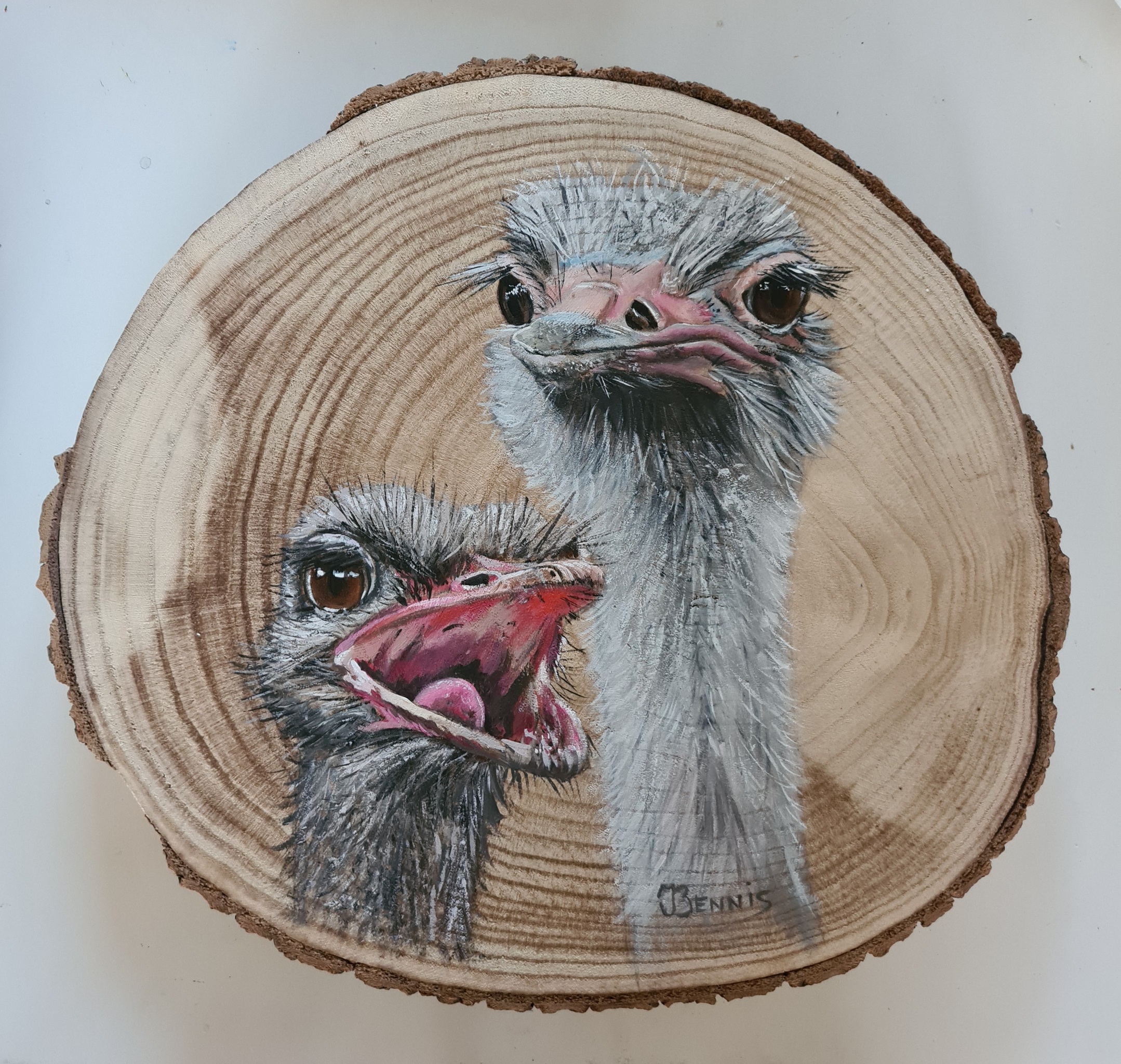 Twee struisvogels , acryl op rondhout