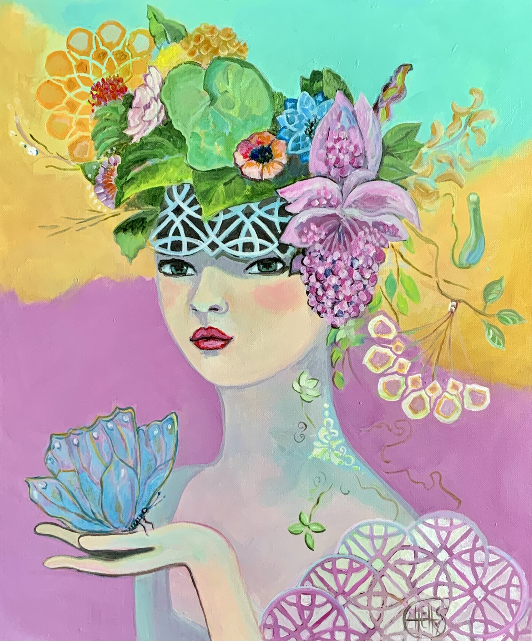 Bloemen en vlinders. Een portret in fantasie met een hoofdtooi van bloemen en op haar hand een blauwe vlinder.