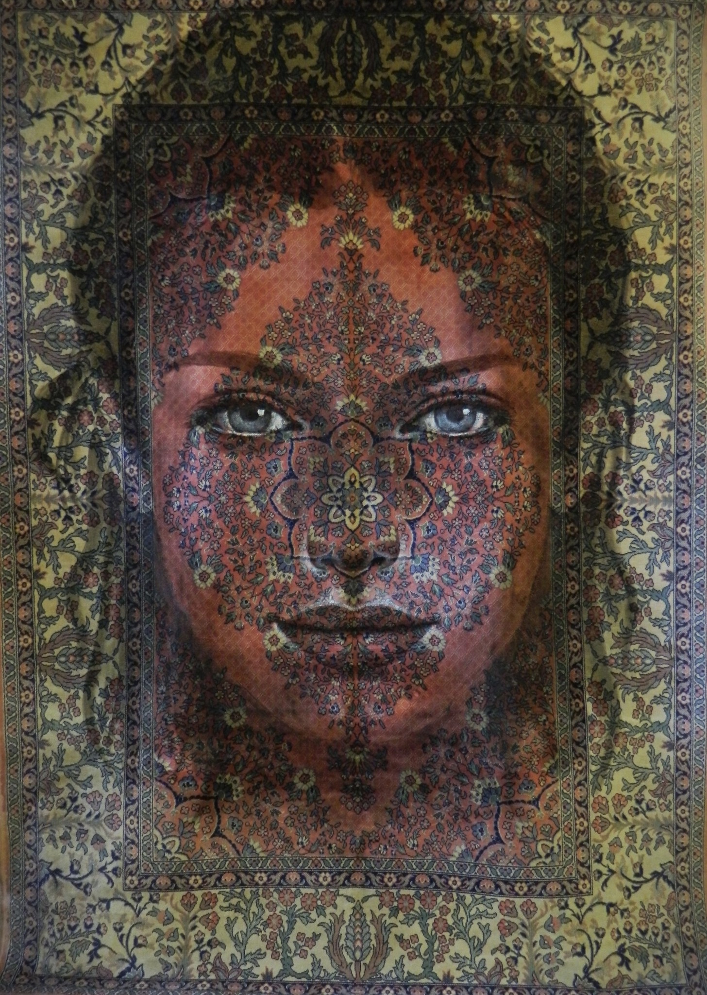 Portrait of Rosalinde on a vintage Persian carpet, with hanging mechanism.