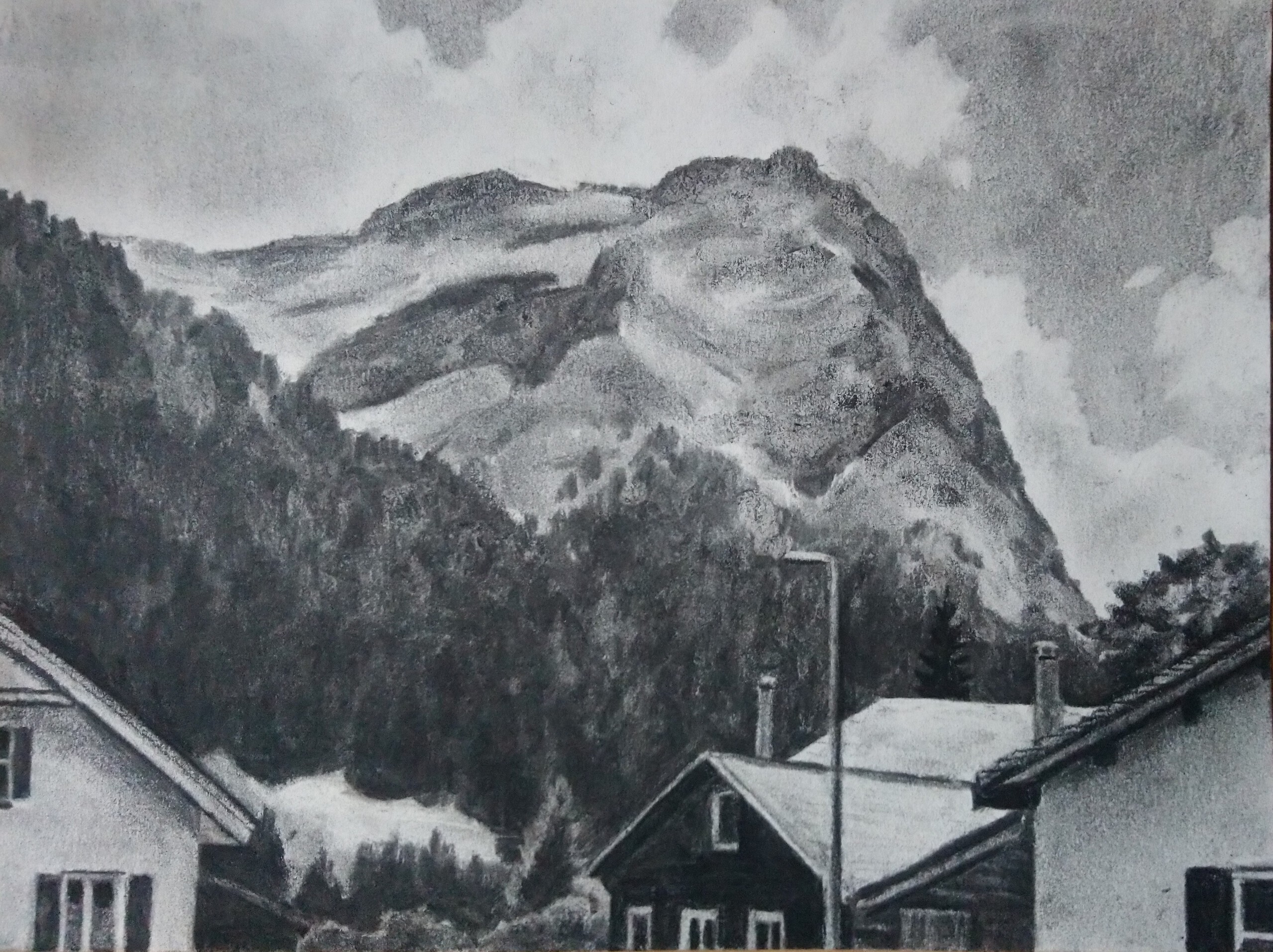 Houtskool Tekening Houtskooltekening Bergen Alpen Huizen Natuur Zwitserland Berglandschap