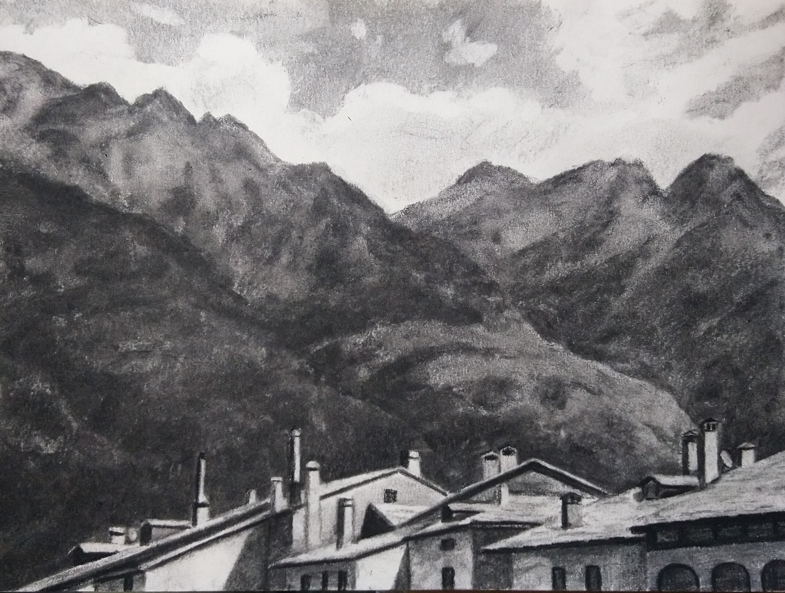 Houtskool Houtskooltekening Zwartwit Bergen Berglandschap Huizen Italië