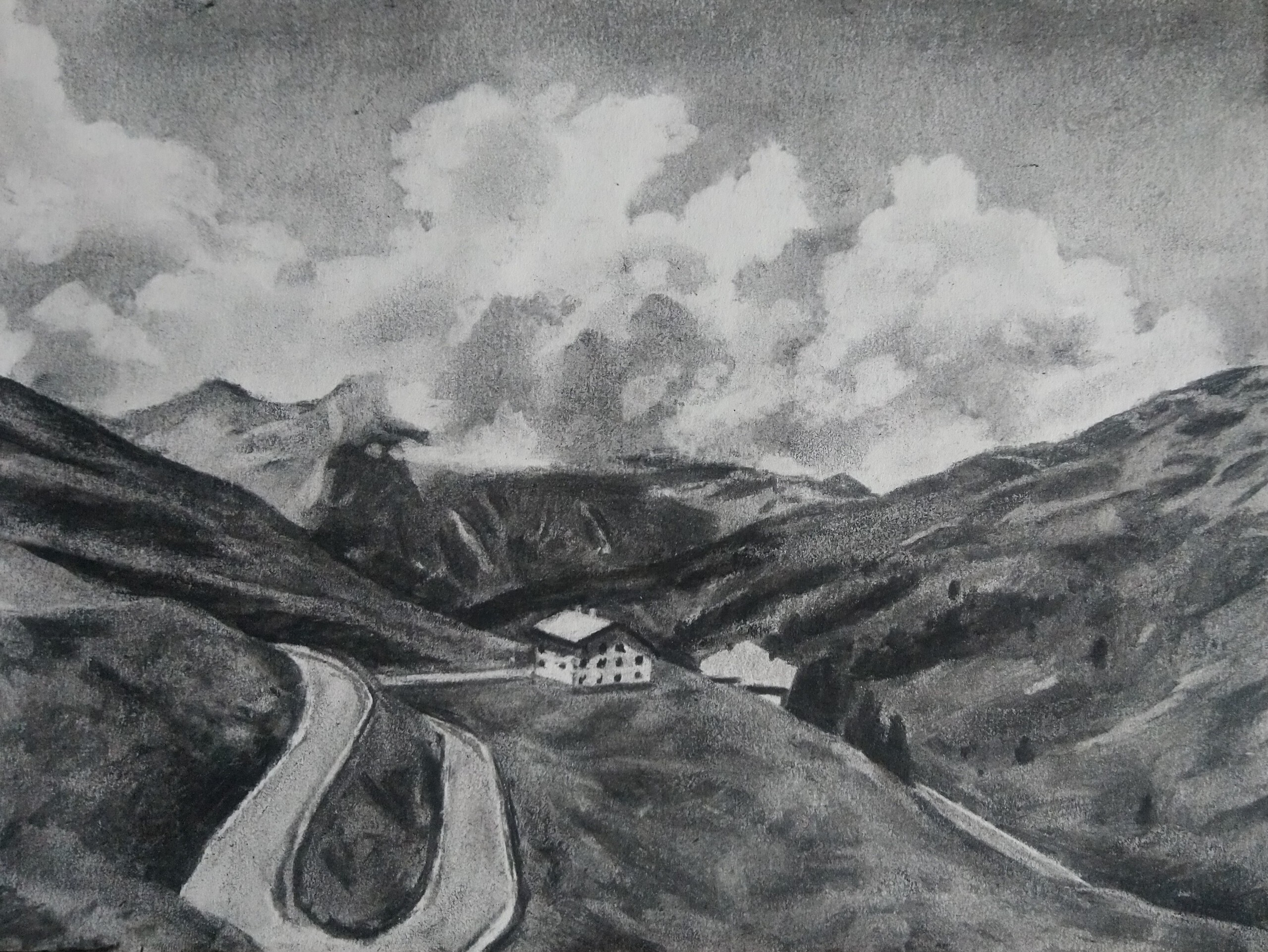 Houtskooltekening Houtskool Tekening Zwartwit Bergen Berglandschap Alpen Weg Natuur Zwitserland Wolken