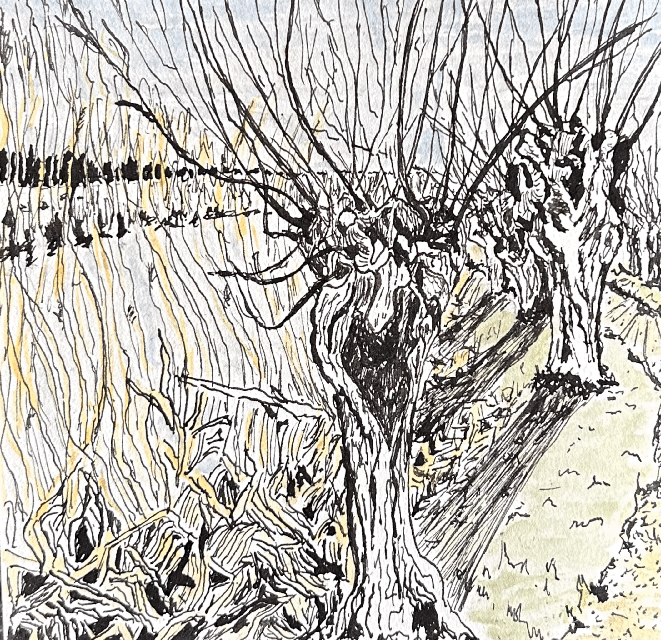 Pentekening ingewassen met aquarel