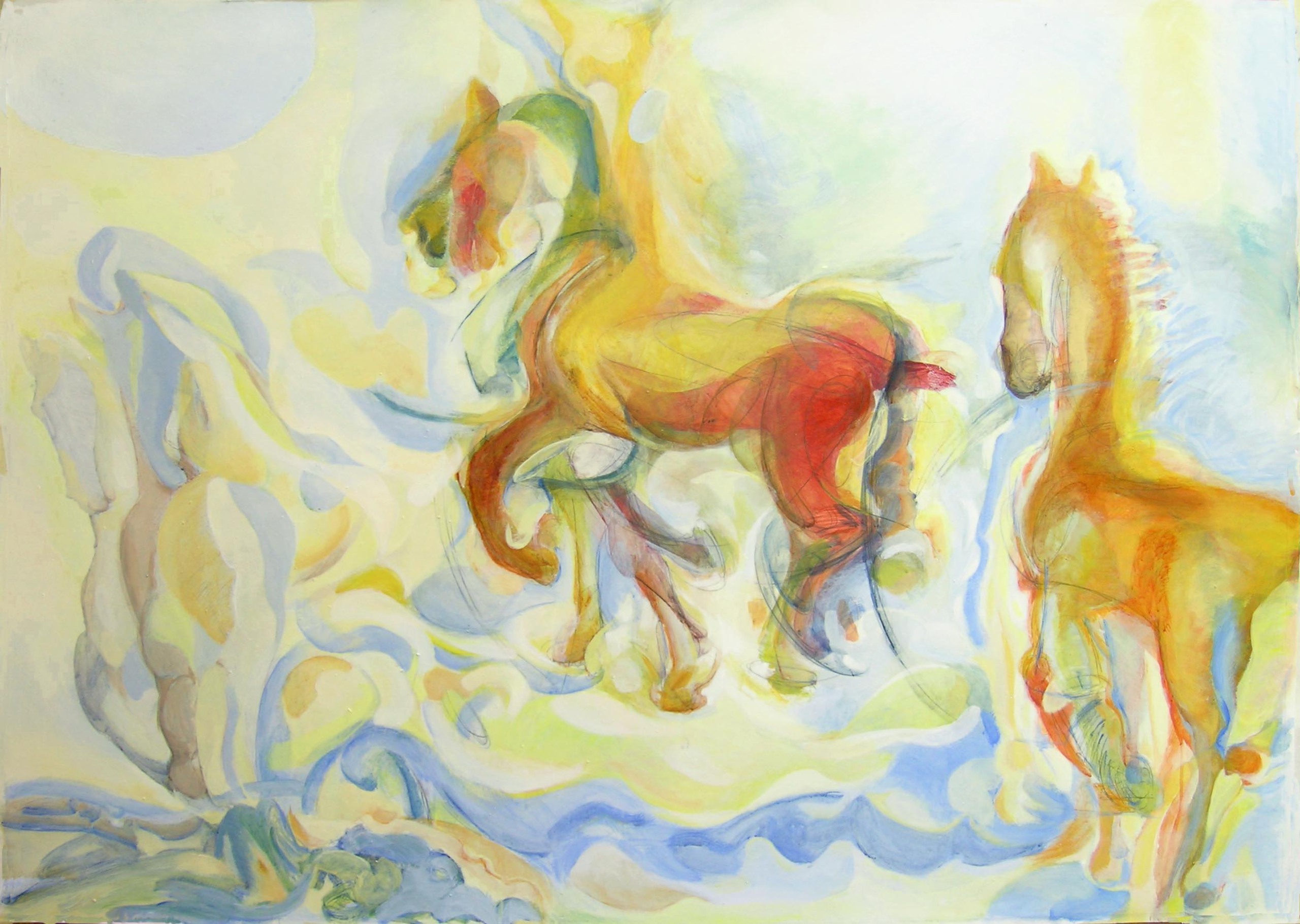 Abstract groot paarden schilderij. De paarden zijn astract weergegeven, waarbij de lijnen en vlakken verspringen en de beweeglijkheid van de paarden weergeven. Ook de omgevende vlakken en lijnen sugereren de beweging. Deze serie schilderijen is gemaakt op Hahnemuhle'r papier en verlijmt op een kunststof ondergrond.