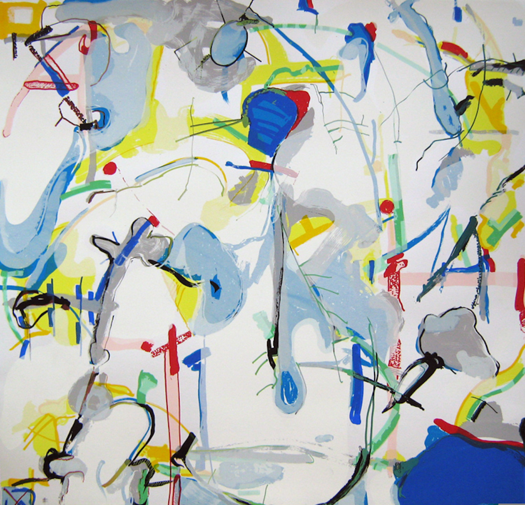 HANDLIJNCOMPOSITIE Meerkleurenzeefdruk in witgewaxte houten lijst van 90 x 90 cm Eigen druk in beperkte oplage (30) / Verkoopcollectie kunstenaar / speciale prijs!!