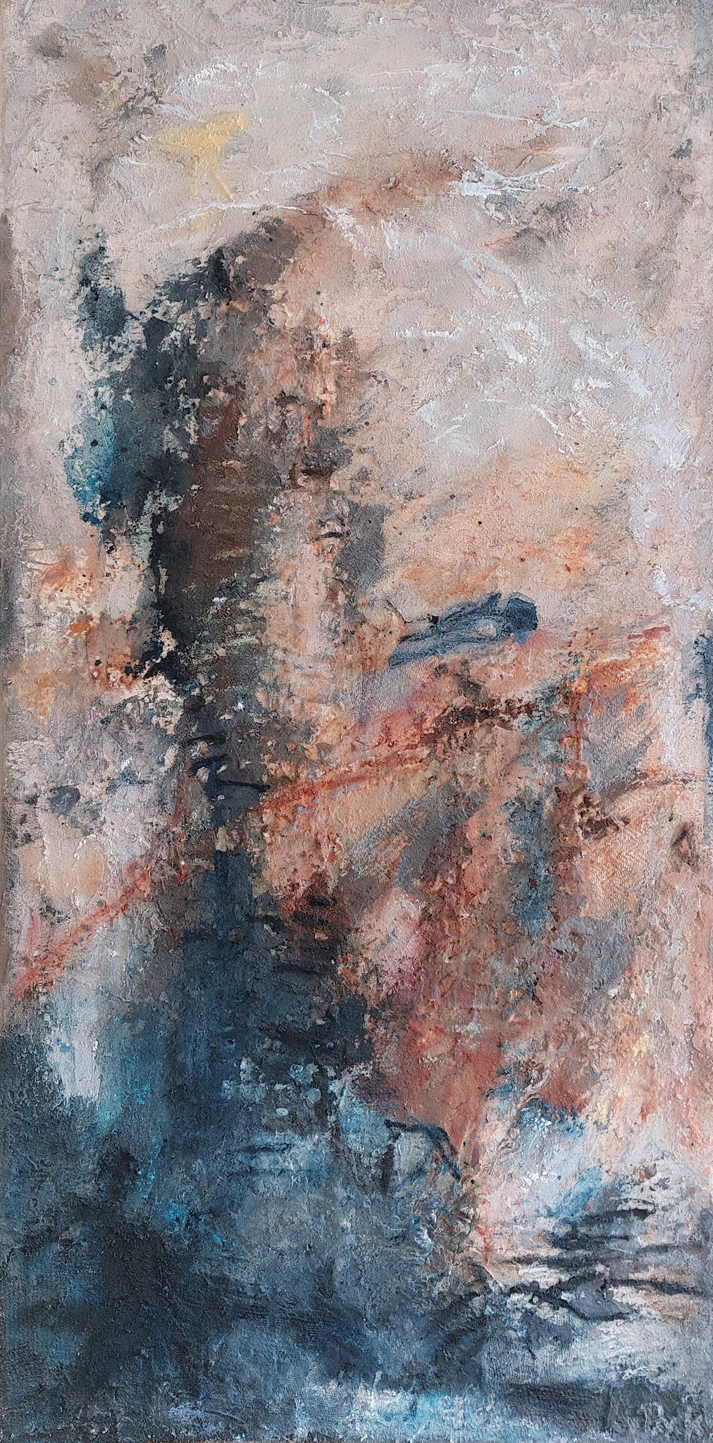 Iets in de buitenwereld intrigeert mij en door deze impressie uit te werken wordt zij blijvend deel van mijn binnenwereld. Laag na laag bouw ik aan de uiteindelijke vorm. Tijdens het werken komt er een stroom van associaties op gang. Het is een constant zoeken naar evenwicht tussen de verf en de andere materialen.