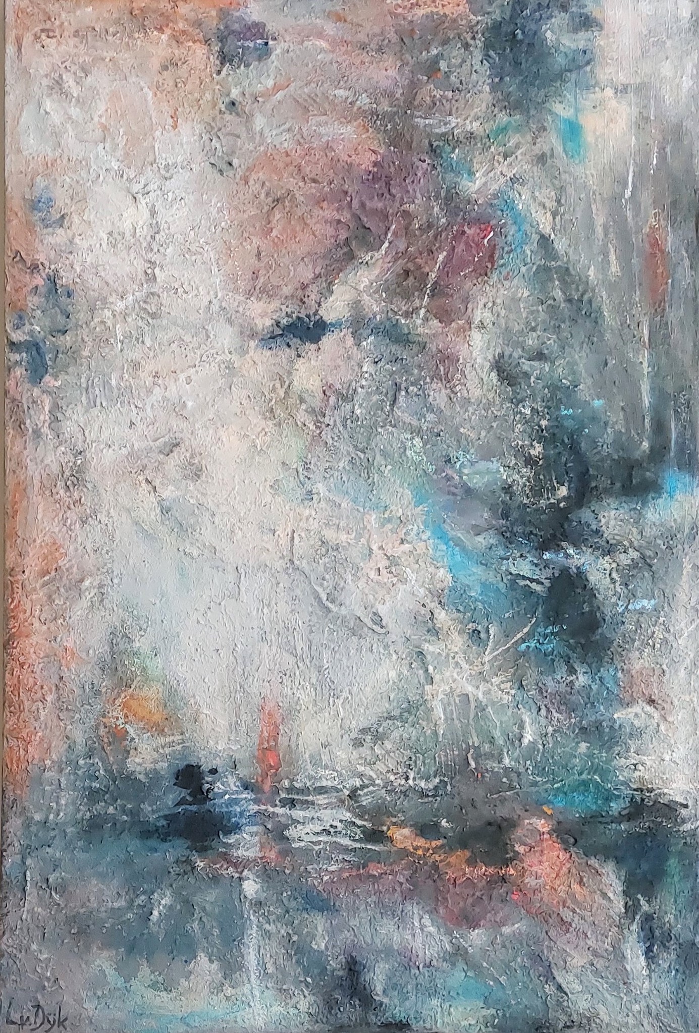Iets in de buitenwereld intrigeert mij en door deze impressie uit te werken wordt zij blijvend deel van mijn binnenwereld. Laag na laag bouw ik aan de uiteindelijke vorm. Tijdens het werken komt er een stroom van associaties op gang. Het is een constant zoeken naar evenwicht tussen de verf en de andere materialen.
