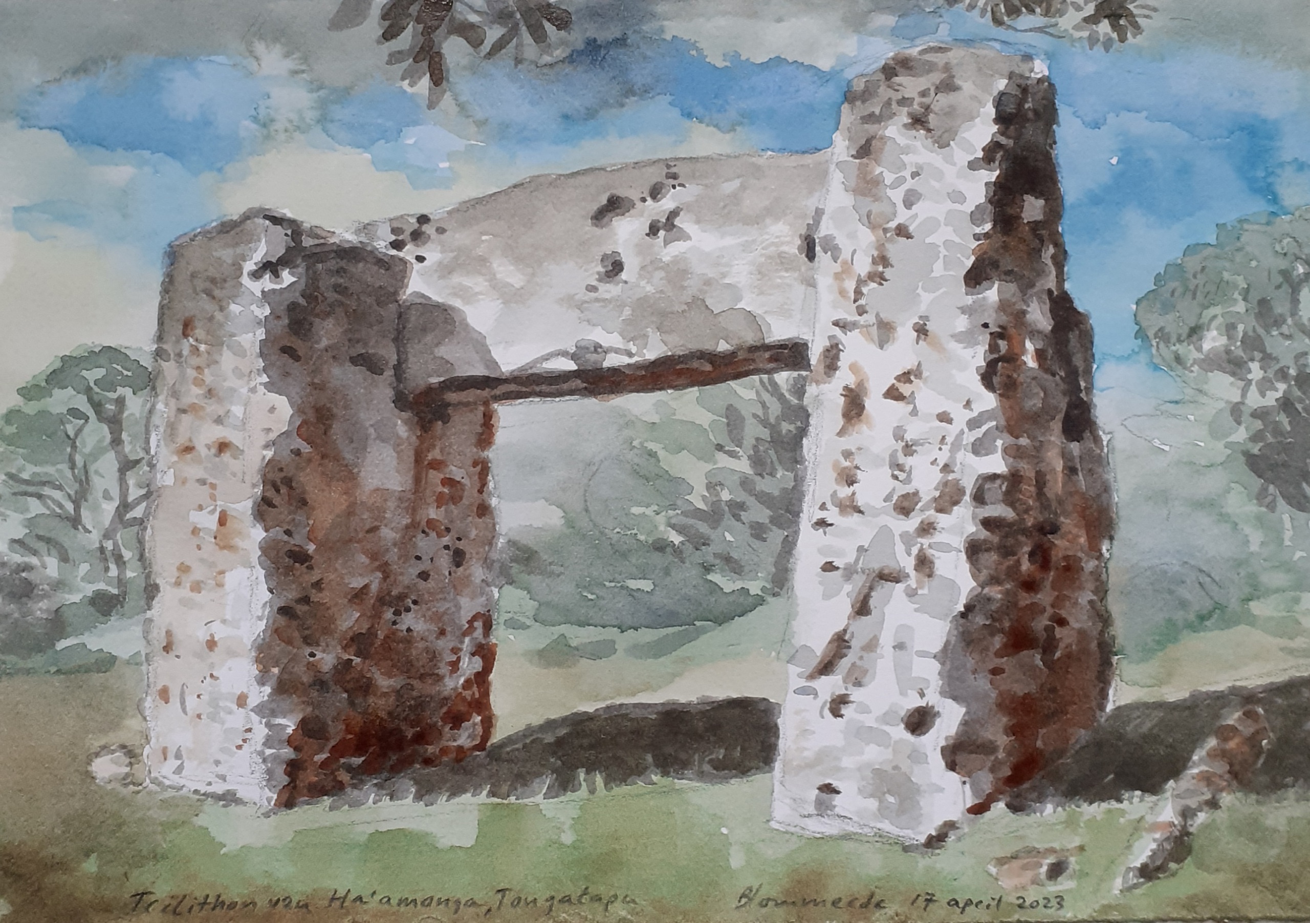 Aquarel van de Trilithon van Ha'amongo, Tongatapu, Polynesië
