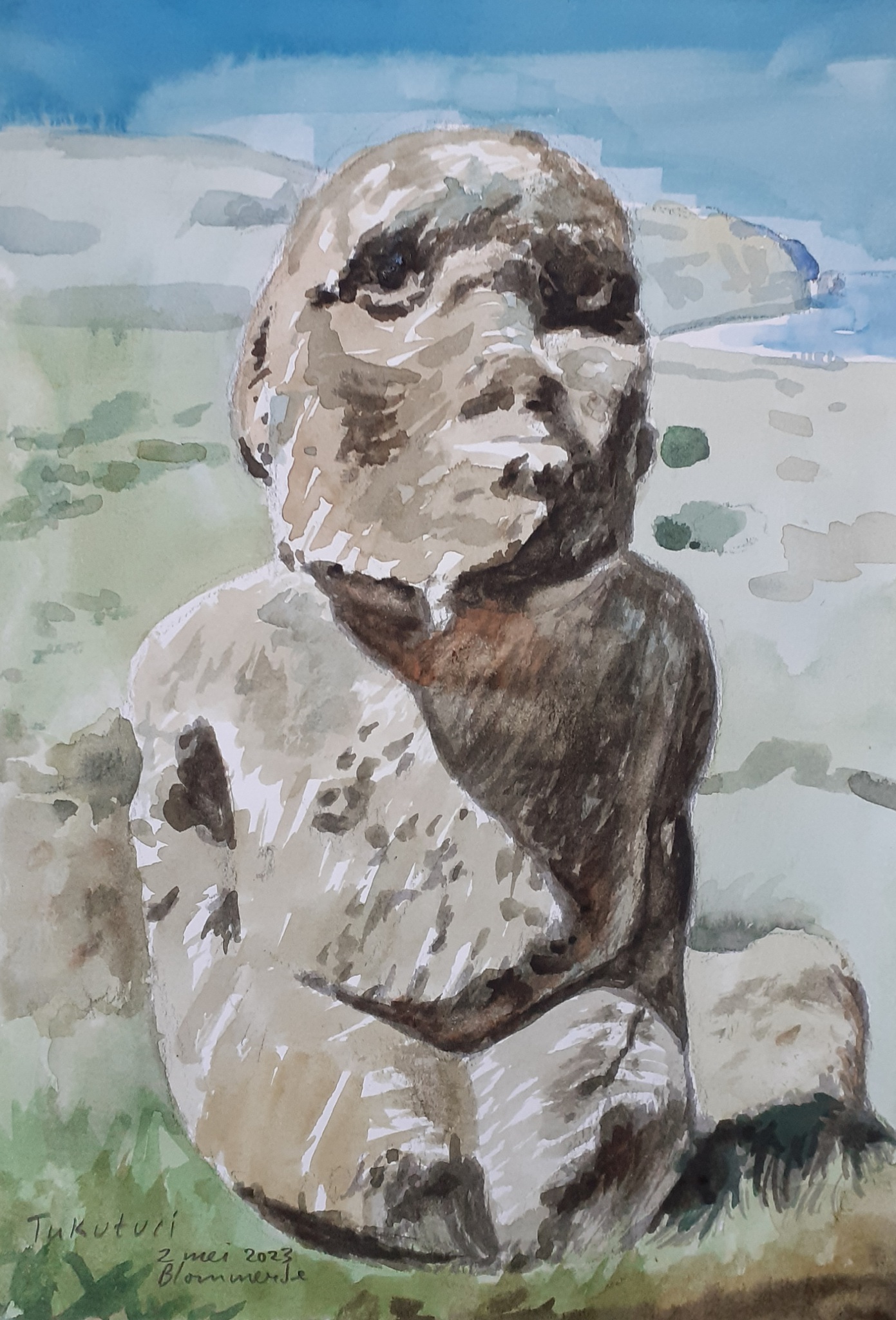 Figuratief Realistisch Tukuturi Moai Paaseiland Polynesië Aquarel