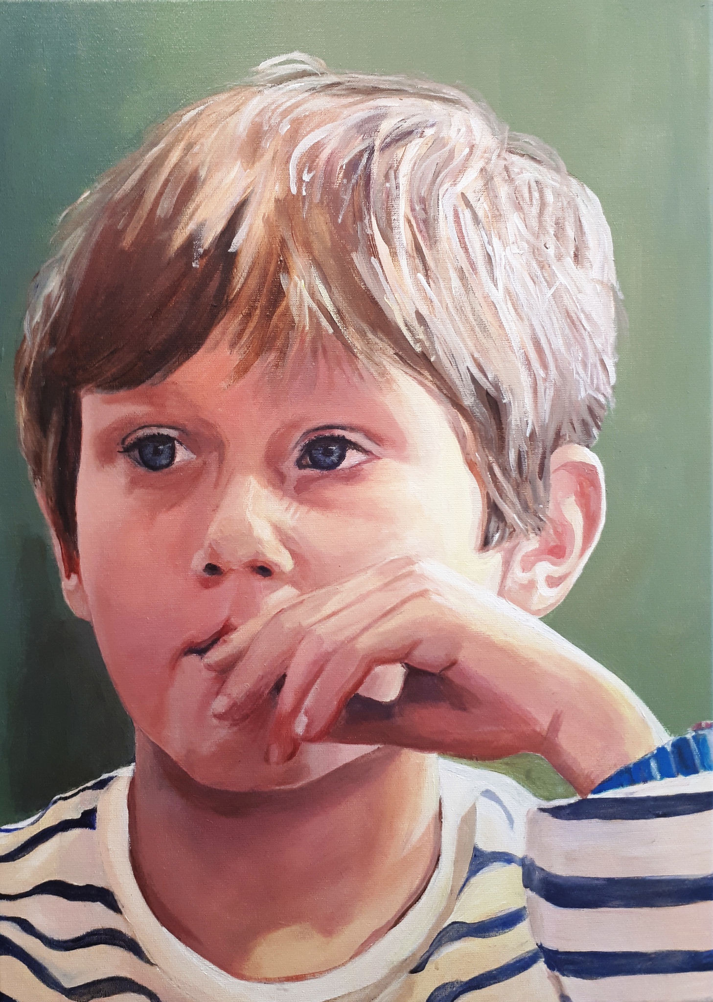 Schilderij Acryl Groen Portret Bruin Hand Canvas Doek Portrait Green Brown Boy Opdracht Jong Commission Acryllic Paining Scheltema Louky Loukyscheltema