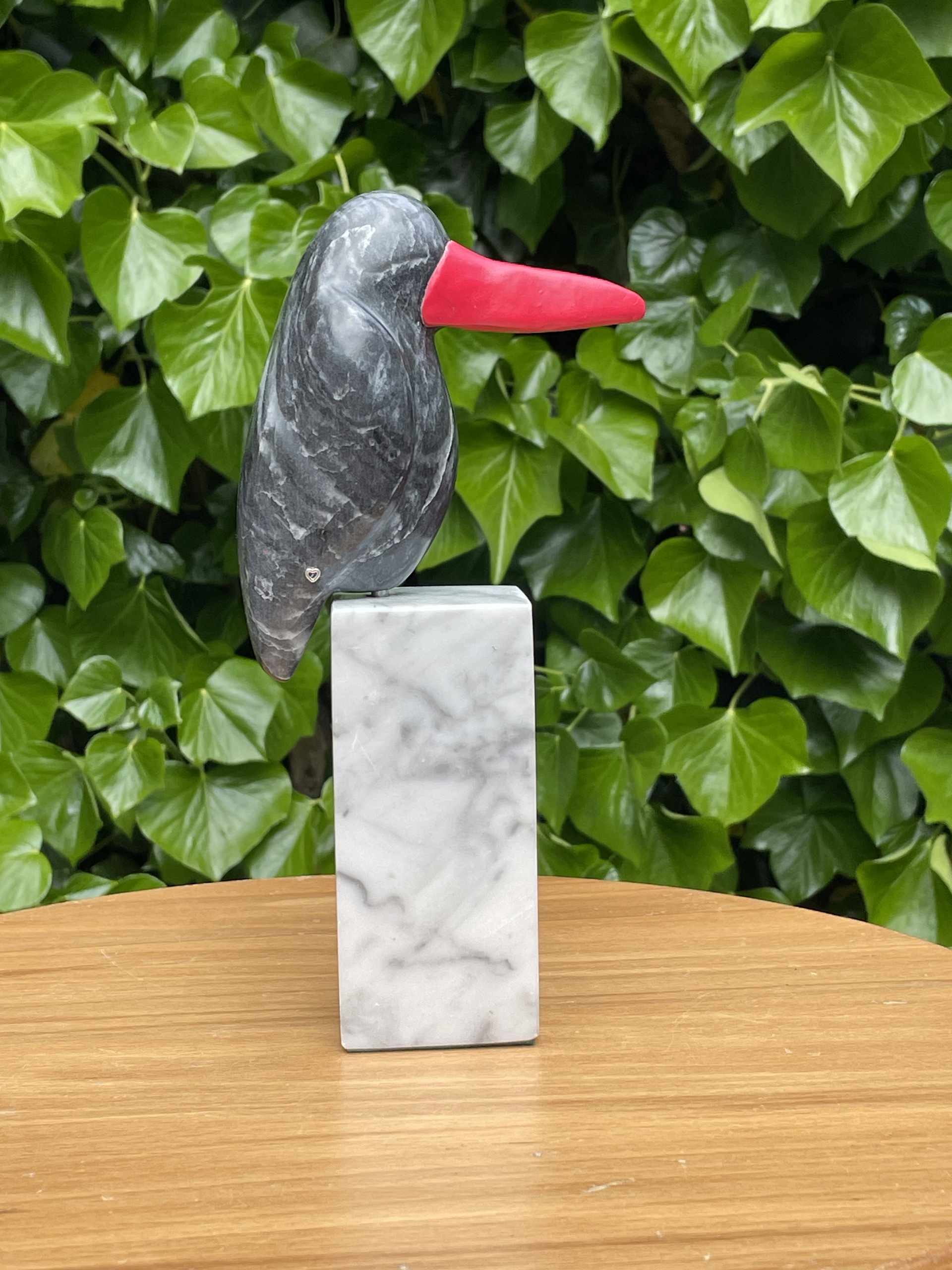 ijsvogeltje van speksteen met snavel van polymeer klei op sokkeltje van marmer