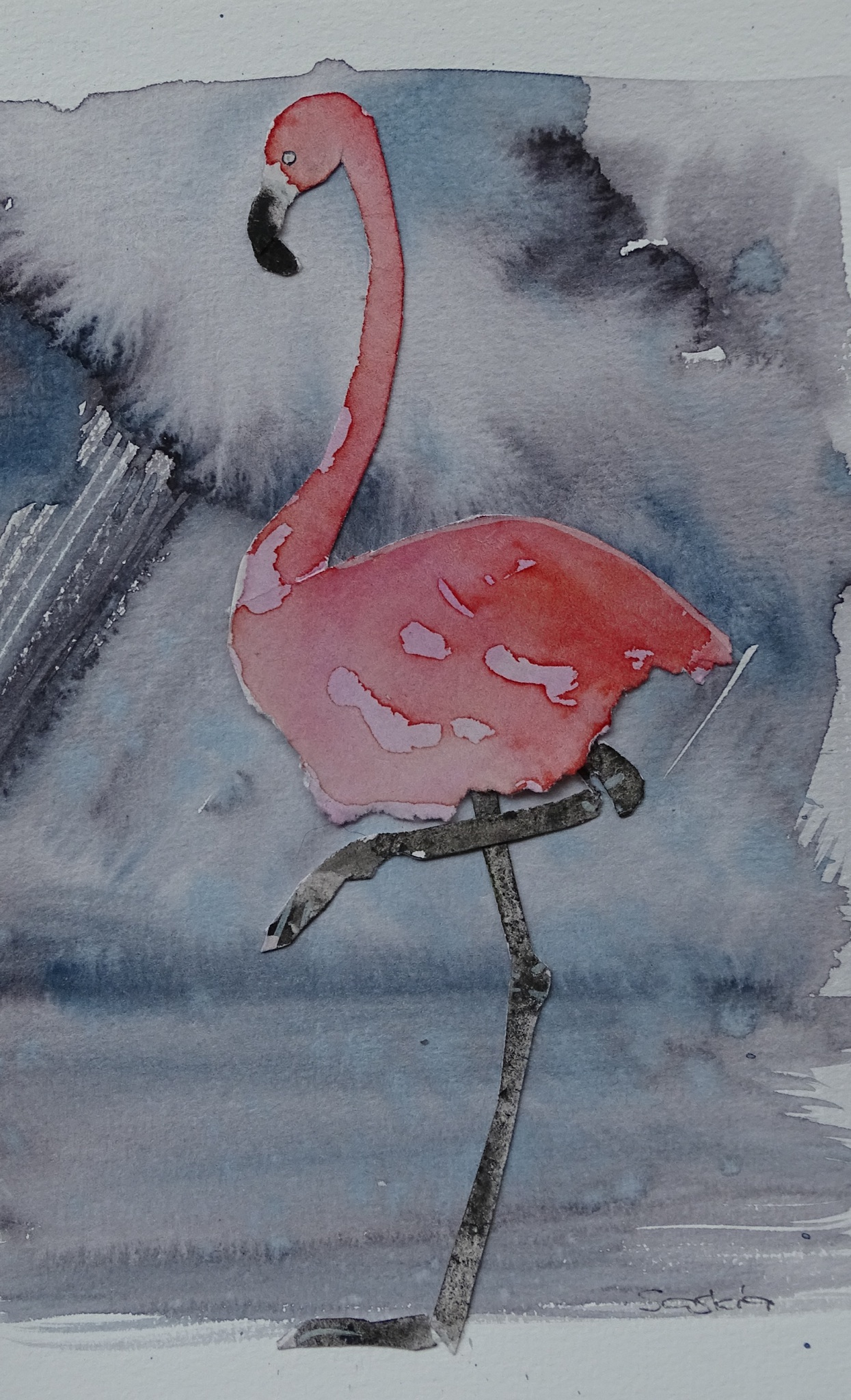 Collage - uit losse hand geknipte flamingo op aquarel achtergrond.
