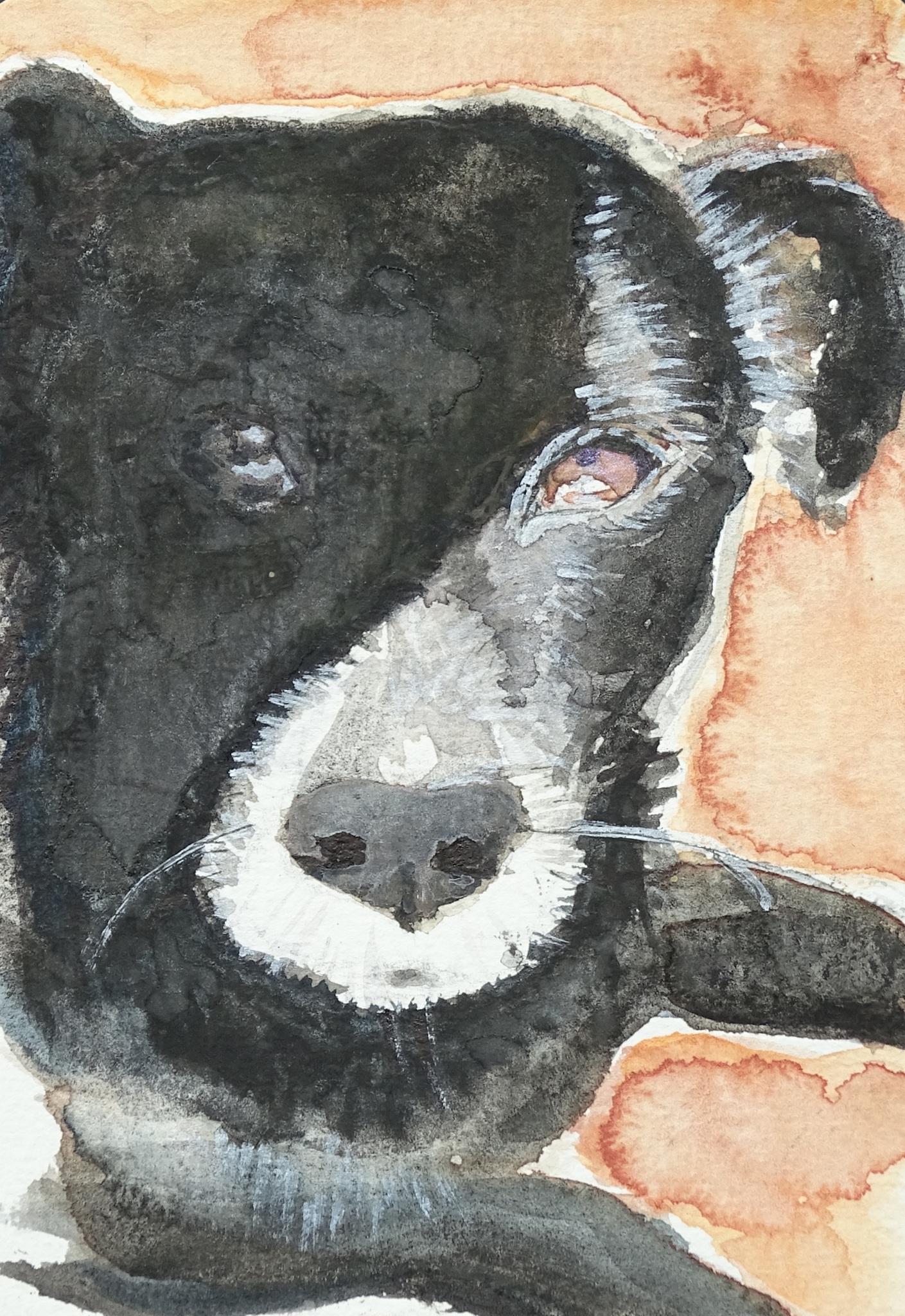 Aquarel van mijn hond met schaduw over zijn hoofd