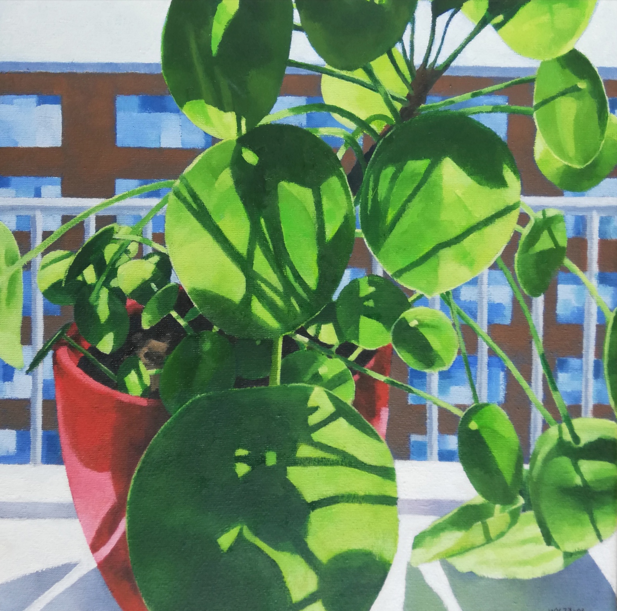 We hadden een stekje van een pannenkoekplant gekregen van onze dochter. Decoratieve en vriendelijk ogende planten, maar ze groeien continu de pot uit. Als 's ochtends de zon in de woonkamer schijnt, ziet het er echter heel feestelijk uit met schaduwen, slagschaduwen en felle lichtpartijen....