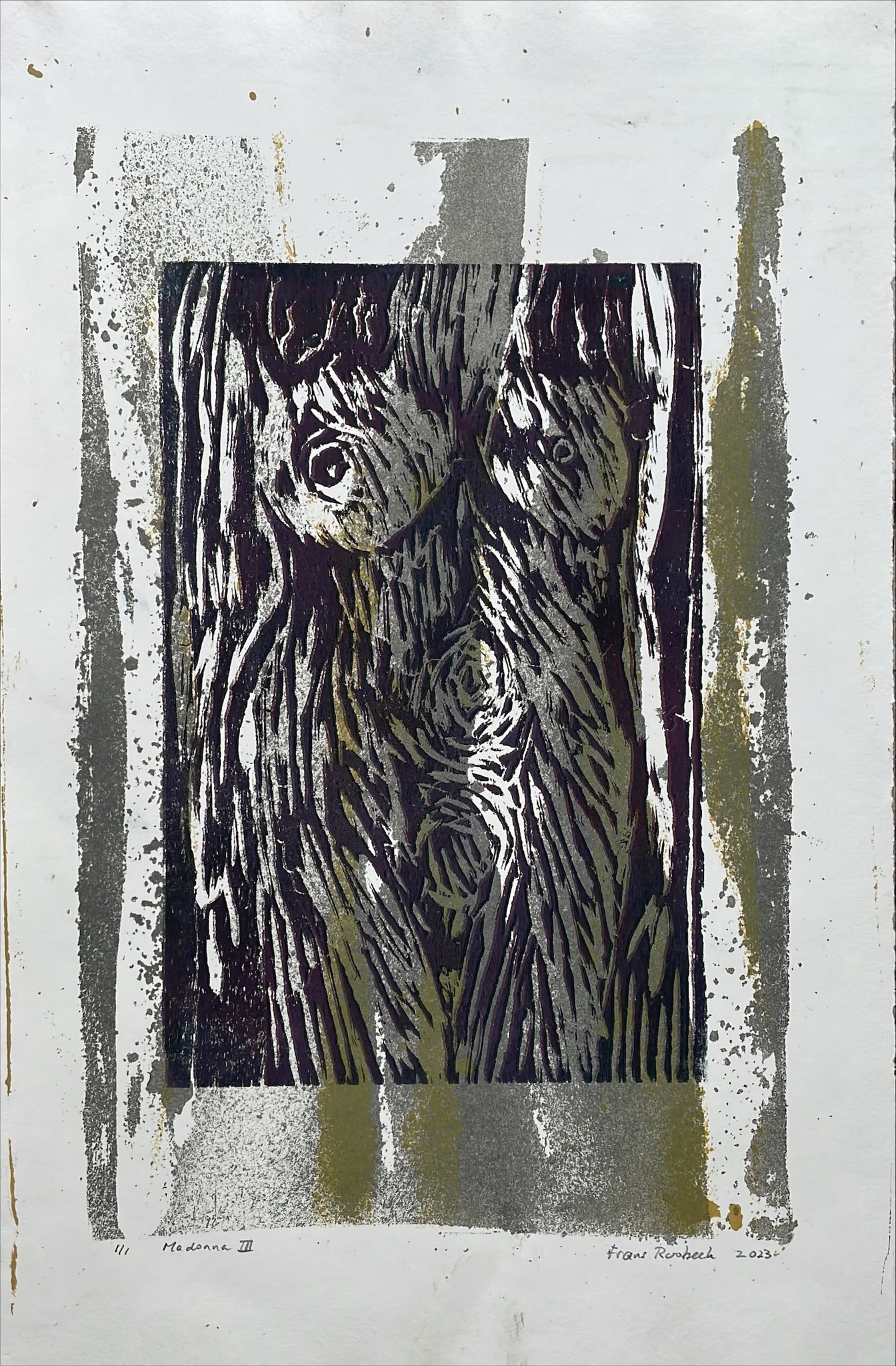 Kleurvariant op Madonna I. Houtsnede gedrukt op een lithografie-achtergrond.