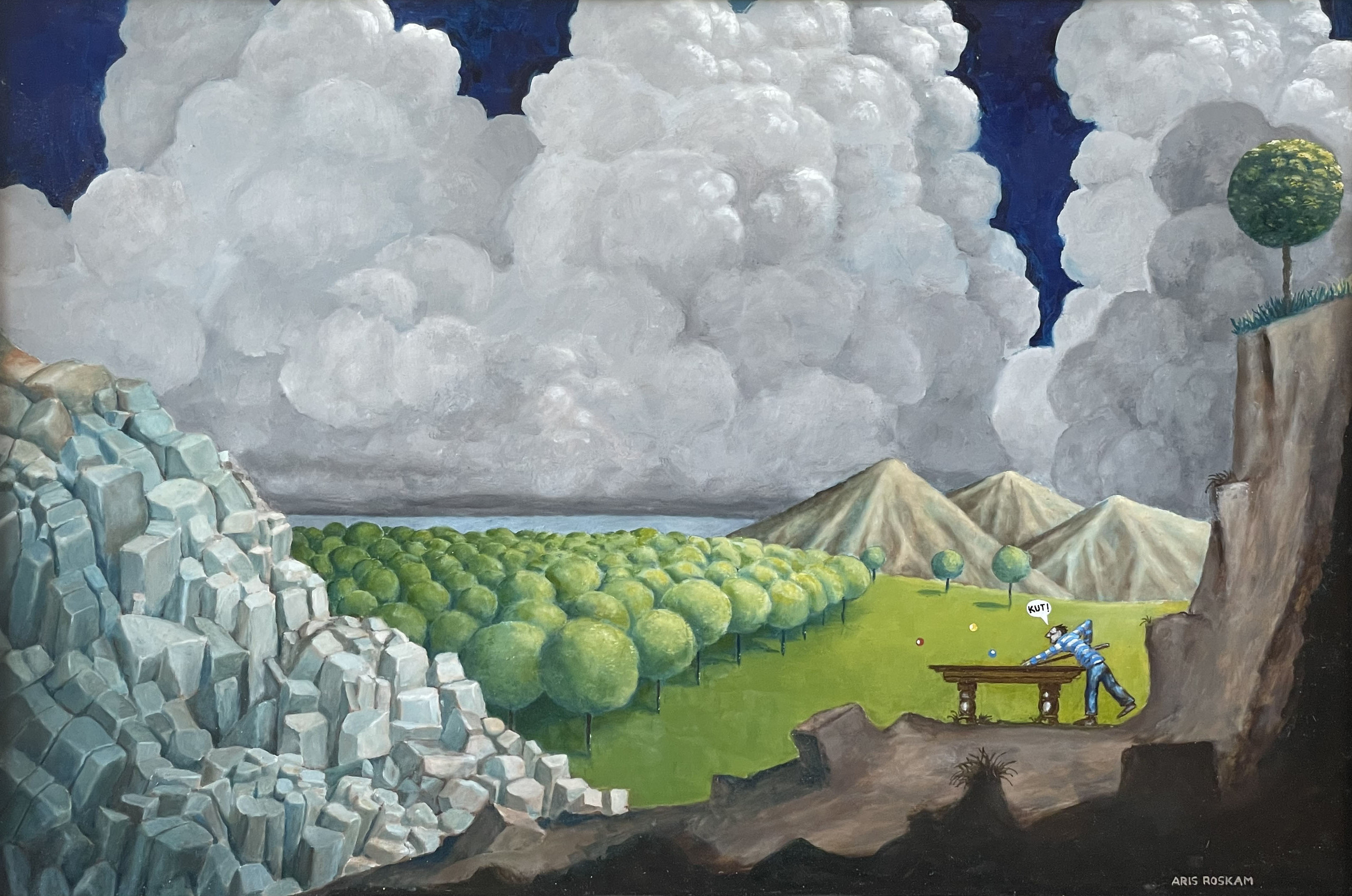 beetje gebaseerd op prenten uit 17e eeuw. een dramatische lucht, wat bos, wat stenen , een bergje en een persoon die een eenvoudige handeling uitvoert, kan hoeden van schapen zijn, kan een visser zijn of iemand die zijn pooltafel er heeft neergezet en wat poolt.